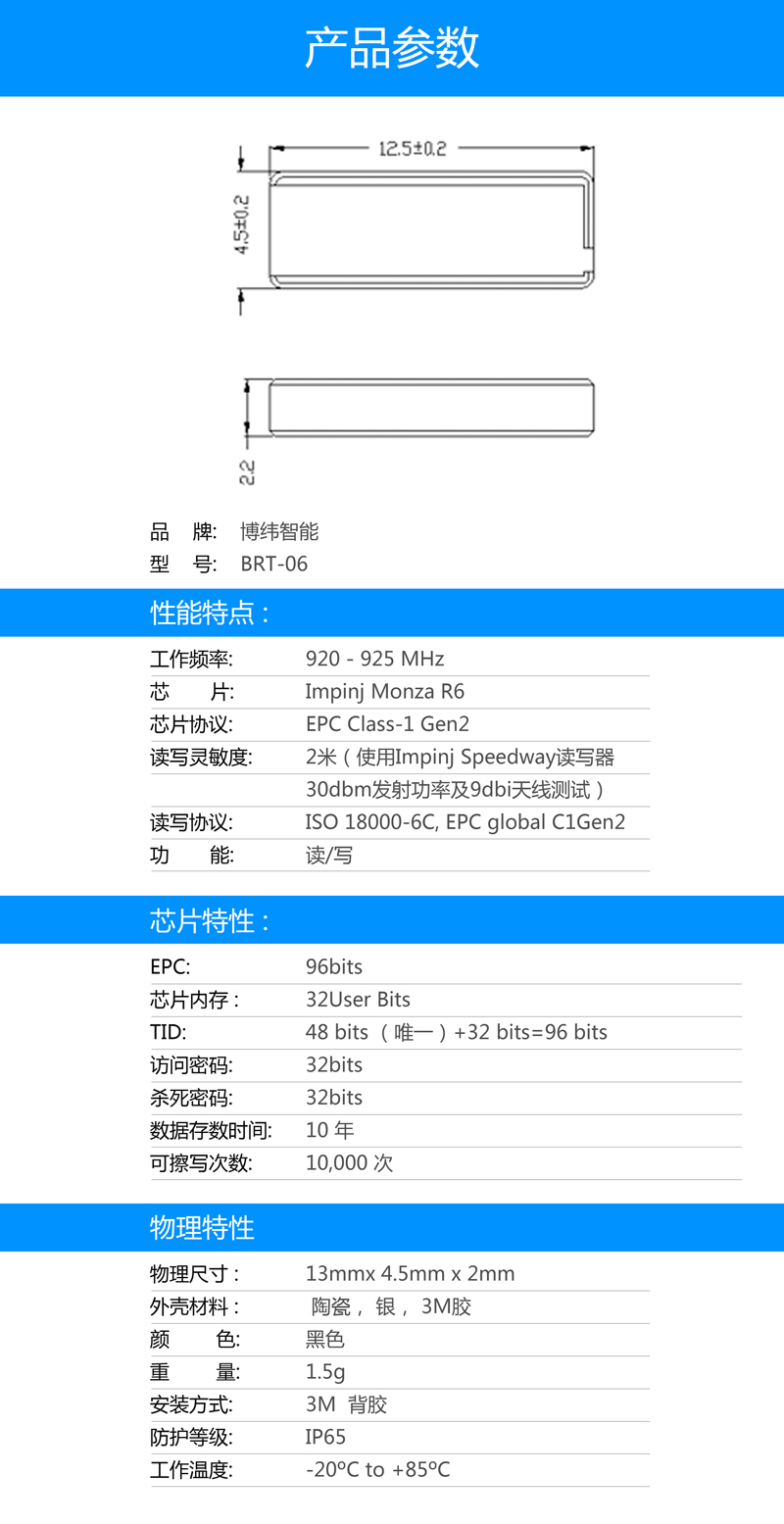 读写距离 | 2米(使用Impinj Speedway读写器30dbm发射功率及9dbi天线测试) | ||