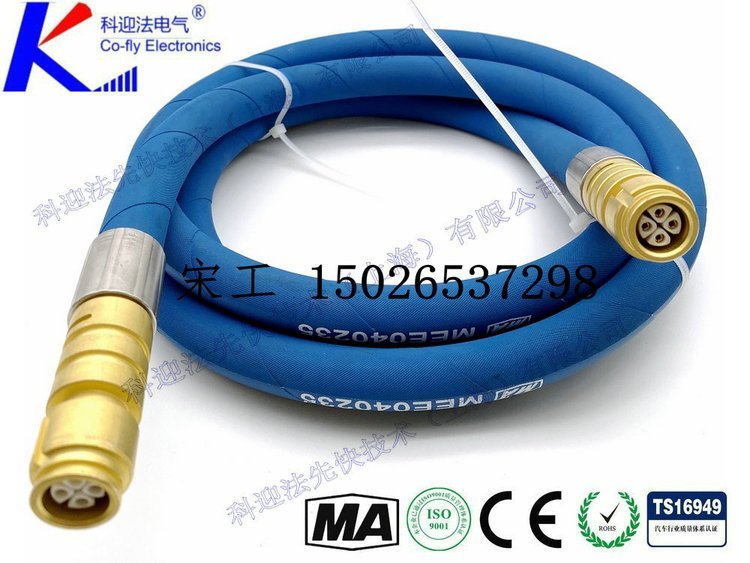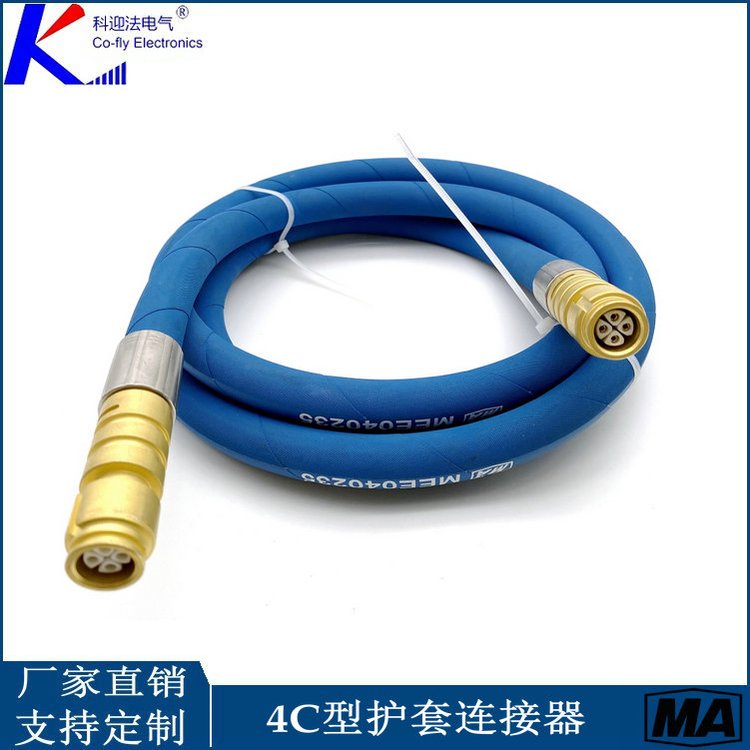 采用铜连接接头,内芯采用四根2平方毫米电线相绞,外部采用兰色高压胶管防护,胶管与连接器之间采用压接方式连接。该连接器具有较好的伸缩性能和抗剪切强度高,结实耐用,插头可做350度旋转,便于安装。用在环境条件 恶劣的区域。