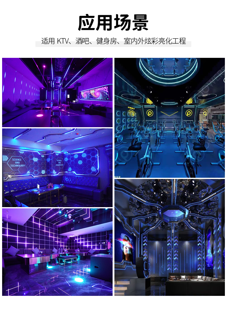 适用场所 | 氛围亮化装饰 室内外亮化装饰 文旅装饰 KTV酒吧娱乐场所装饰 车展婚宴景观装饰 狭小缝隙装饰灯条 亮化装饰方案 | ||