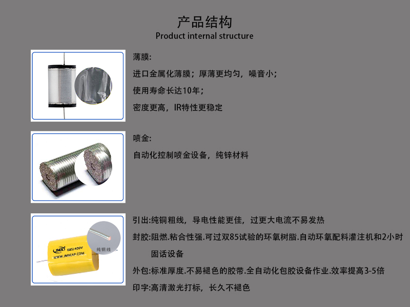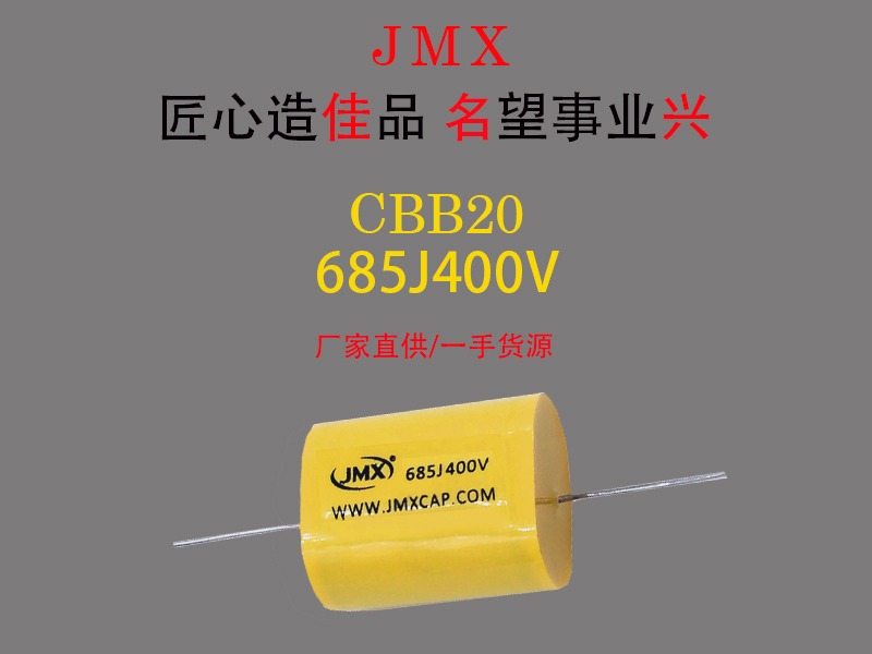 音响薄膜电容685J400V,采用用金属化“聚丙烯膜” 作电介质/电极绕制而成,引线采用镀锡铜包钢线,外层用聚酯胶带包裹,两端灌注环氧树脂。