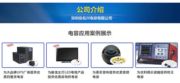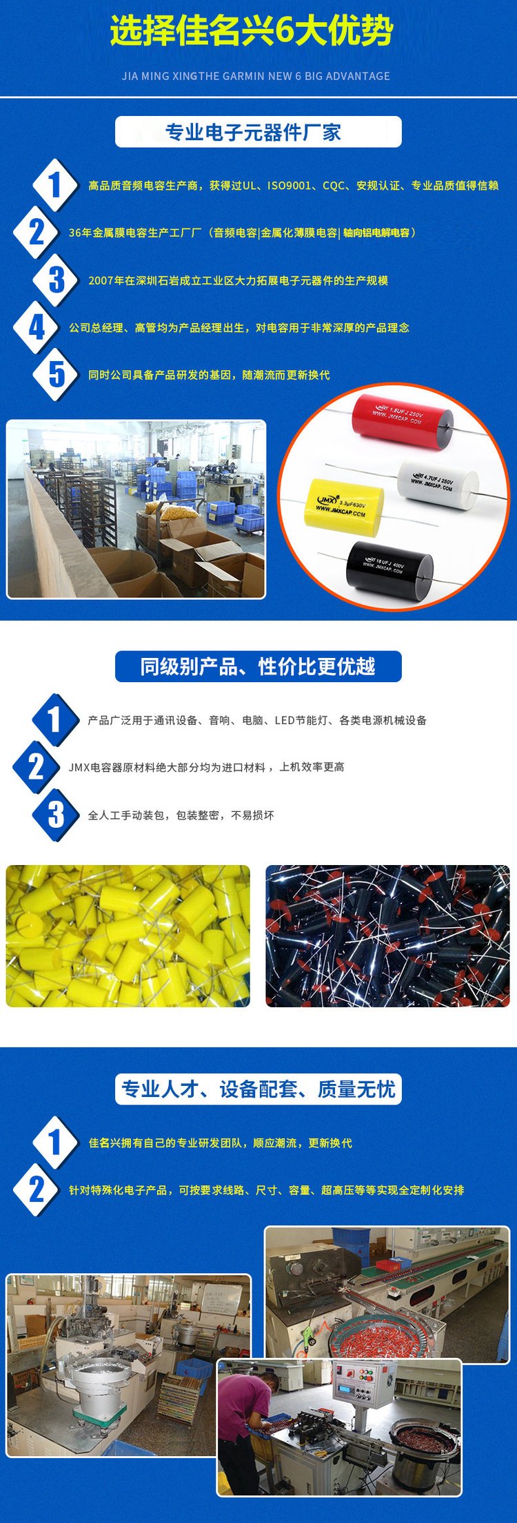 24.9年金属膜电容生产工厂佳名兴为你提供高性价比电容,免费寄送样品、供客户参考!!!?(主营产品:音频电容丨金属化薄膜电容丨轴向电解电容等)? ? 热烈欢迎超声波、音响、功放、电源、LED照明、电脑周边、通讯设备等厂家来电购买或者咨询:0755-85274135!应用:广泛应用UPS,逆变器,感应加热,电焊机等设备结构:?双面金属化与金属化膜内串结构,用金属化聚丙烯膜作电介质/电极绕制而成,引线采用镀锡铜包钢线,外层用聚酯胶带包裹,两端灌注环氧树脂?