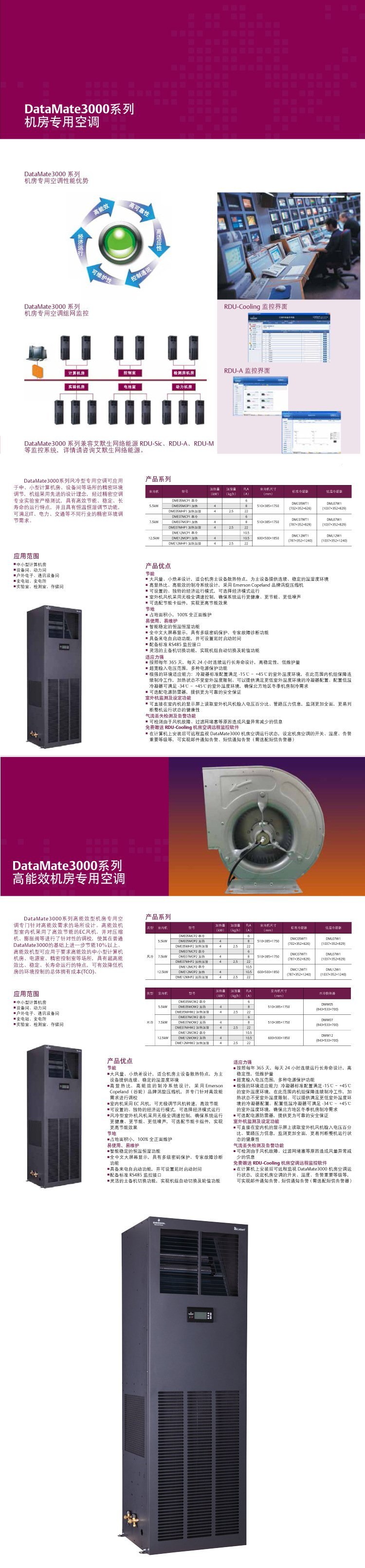 ?DataMate3000小型机房空调产品系列,是艾默生网络能源有限公司采用先进的科学设计方法,专为小型通信机房,小型IT机房,移动通信基站开发设计,经过精密空调专业实验室的严格测试,具有 高 ? 效 ?的制冷系统,稳定可靠的使用寿命,长期运行的能力,特别是使用寿命长,适应机房运行需要的特点。