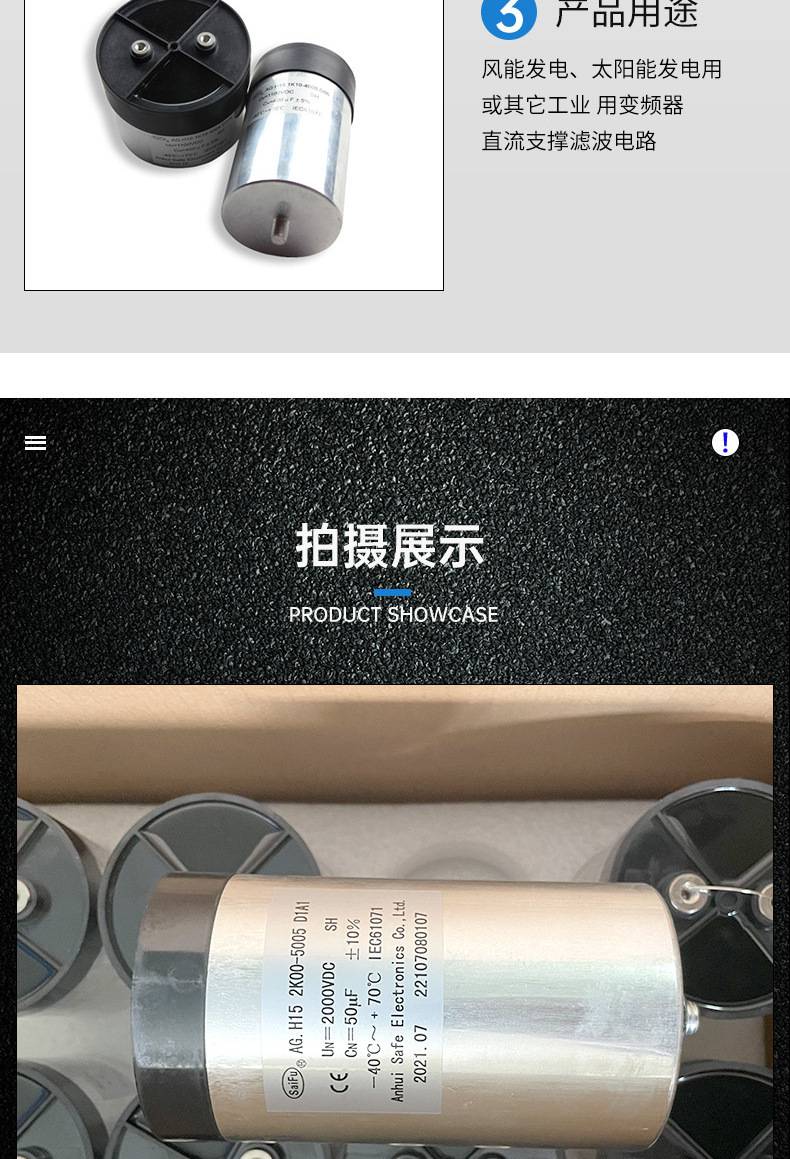 赛福? ?石油机械直流储能支撑薄膜电容CDC? 850VDC 2200UF主要采用聚丙烯薄膜介质直流支撑电容器,其具有耐电压高、耐电流大、低阻抗、低电感、容量损耗小、漏电流小、温度性能好、充放电速度快、使用寿命长(约10万小时)、安全防爆稳定性好、无极性安装方便等优点。应用于电力电子行业。