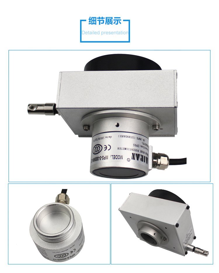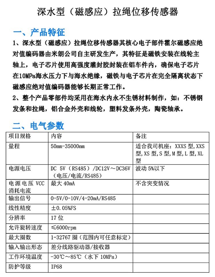 深水型(磁感应)拉绳位移传感器其核心电子部件霍尔磁感应编码器由米朗公司自主研发生产,其特征是磁铁安装在线轮主轴上,电子芯片使用高强度灌封胶封装在铝车件内,确保电子芯片在10Mpa海水压力下与海水绝缘,磁铁与电子芯片在完全隔离状态下磁感应编码器能够长期正常工作。 深水型(磁感应)拉绳位移传感器整个产品零部件均采用在海水内永不生锈材料制作,如:不锈钢发条和拉绳,铝合金外壳和线轮,塑料发条外壳,陶瓷轴承。