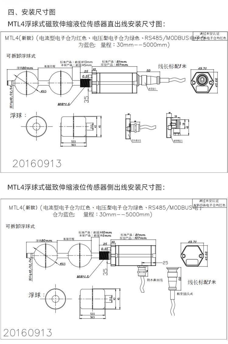 米朗MTL4-1000MM-N/A-P磁致伸缩液位传感器 浮球式 精度高无温漂 品牌 | 米朗MIRAN | ||
