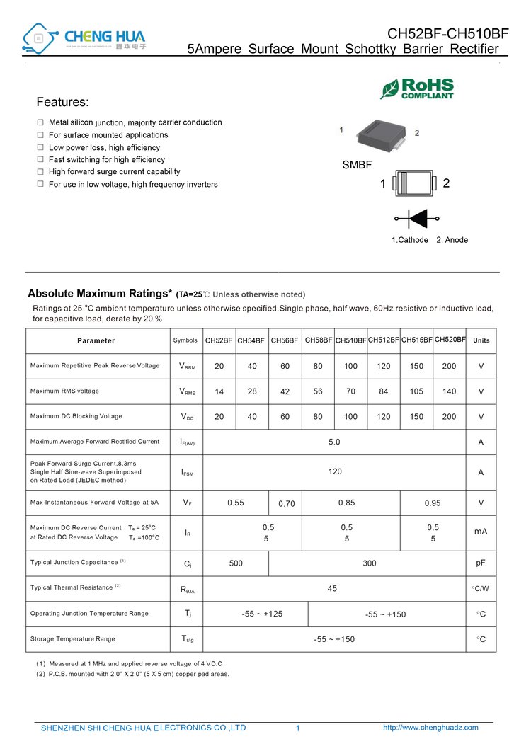 CH510BF是一款由深圳市程华电子有限公司生产的一款肖特基二极管,具备出色的电气性能,其电压达100V,电流达120A。该二极管采用SMBF封装,并且符合RoHS标准。