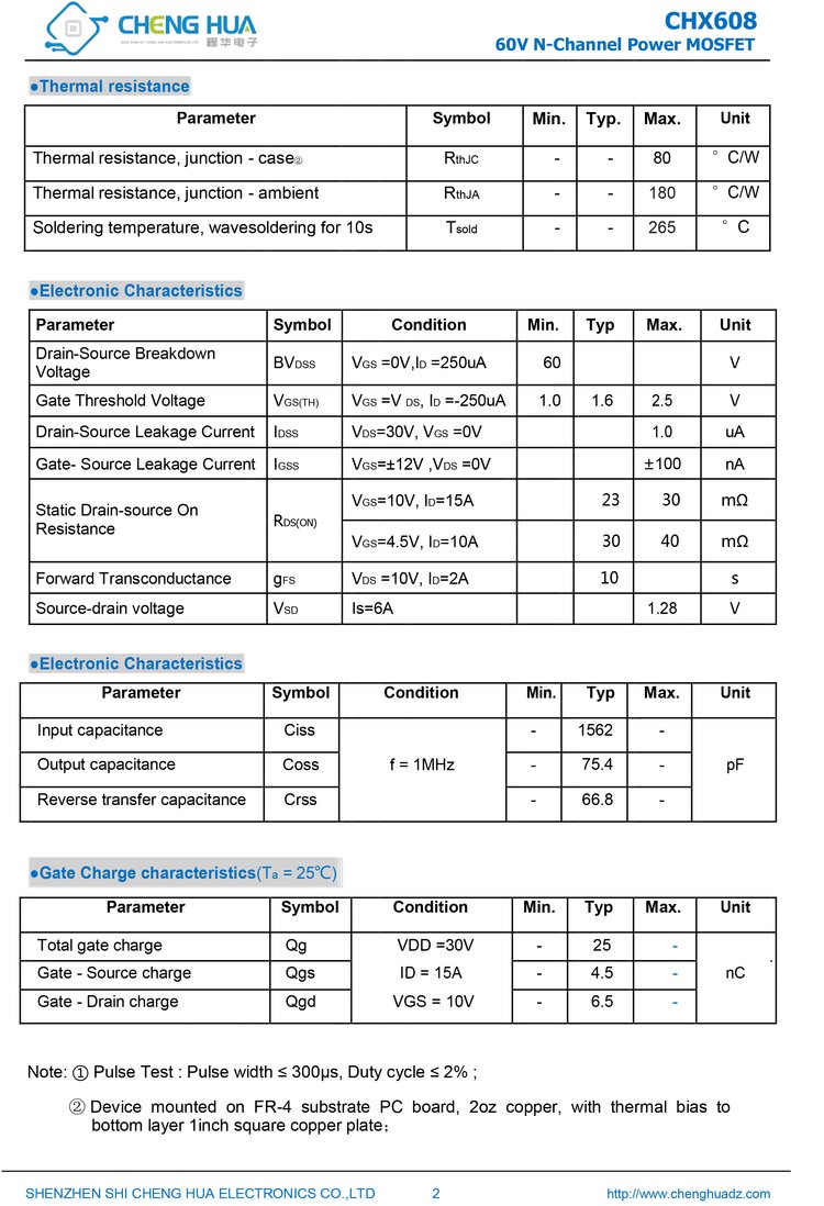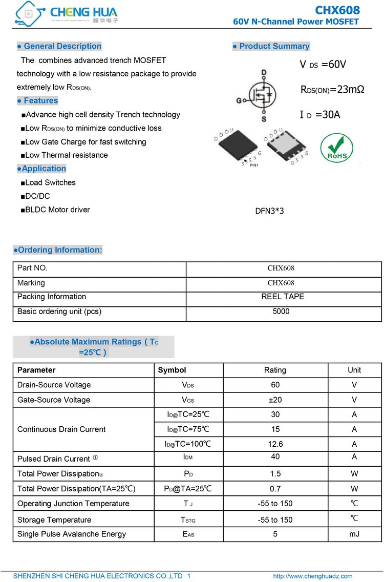CHX608漏极电压VDS=60V;漏极电流ID=30A