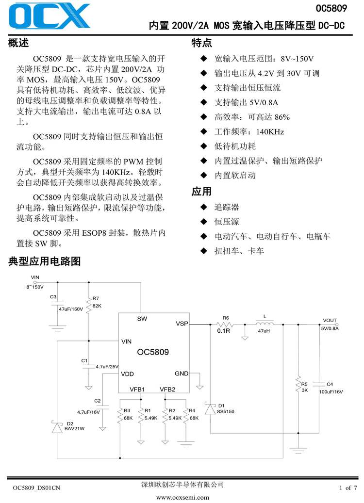 OC5809 是一款支持宽电压输入的开关降压型DC-DC,芯片内置200V/2A 功率MOS,最高输入电压150V。OC5809具有低待机功耗、高效率、低纹波、优异的母线电压调整率和负载调整率等特性。支持大电流输出,输出电流可达0.8A以