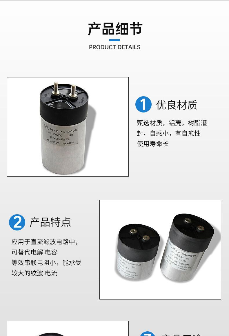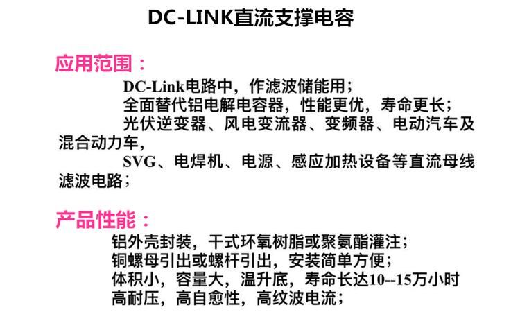 赛福DCLINK 60UF 2500VDC高压变频器消磁器储能滤波薄膜电容采用聚丙烯薄膜介质直流支撑电容器,其具有耐电压高、耐电流大、低阻抗、低电感、容量损耗小、漏电流小、温度性能好、充放电速度快、使用寿命长(约10万小时)、安全防爆稳定性好、无极性安装方便等优点。