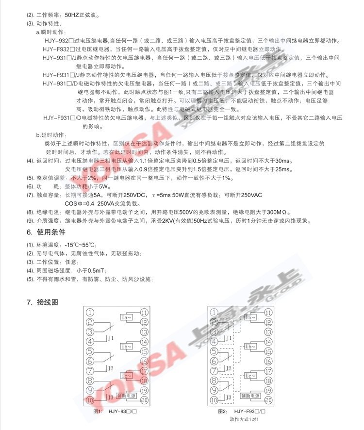 HJY-F931□/J静态动作特性的欠电压继电器,当任何一路输入电压低于拨盘整定值,仅对应中间继电器立即动作。??