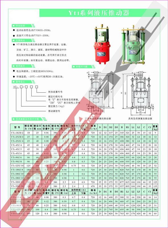 产品用途 | 主要应用于起重、运输、冶金、矿山、港口、建筑、建材等机械制动中外抱瓦块式制动器的驱动装置 | ||