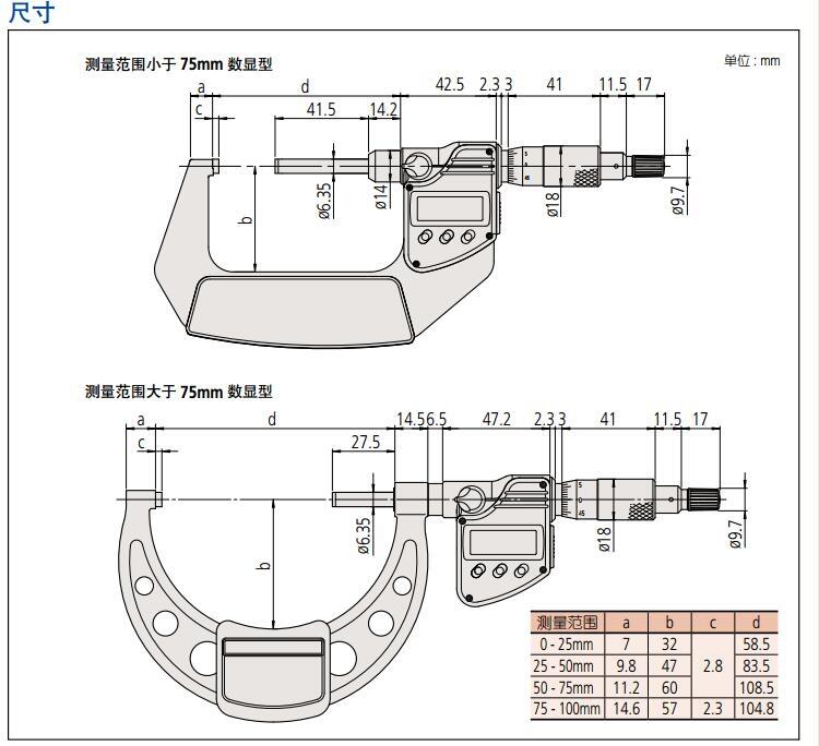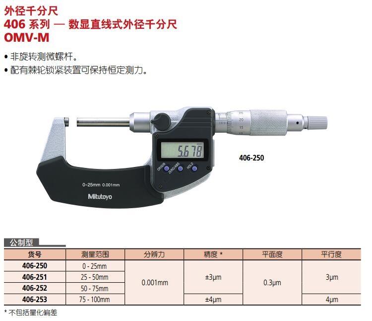 日本三丰Mitutoyo直进式外径数显千分尺 406-250非旋转芯轴型0-25