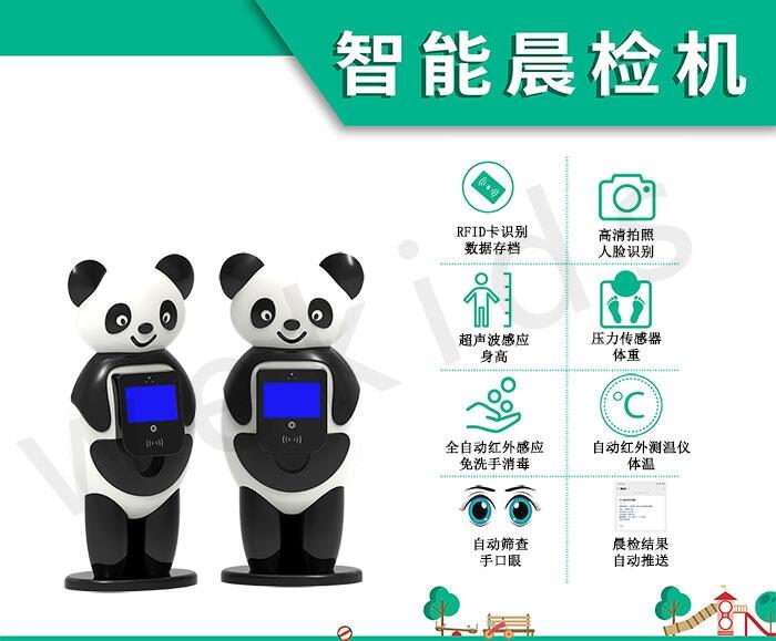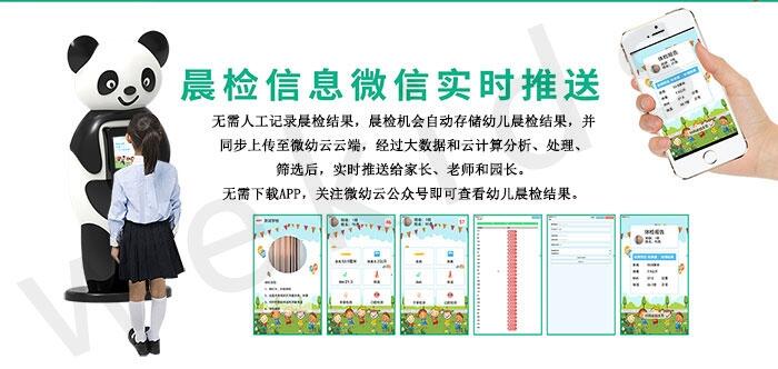 另外微幼科技的晨检机器人可以在几秒之内智能近距离无接触感应小朋友的手部、眼部、口腔、身高、体重、体温和免洗手消毒等。采用环保的吸塑材料外壳,儿童接触无伤害,大数据平台对小朋友的晨检结果进行分析、筛选和处理,从而生成35项晨检结果,智能推送给家长、老师和园长。