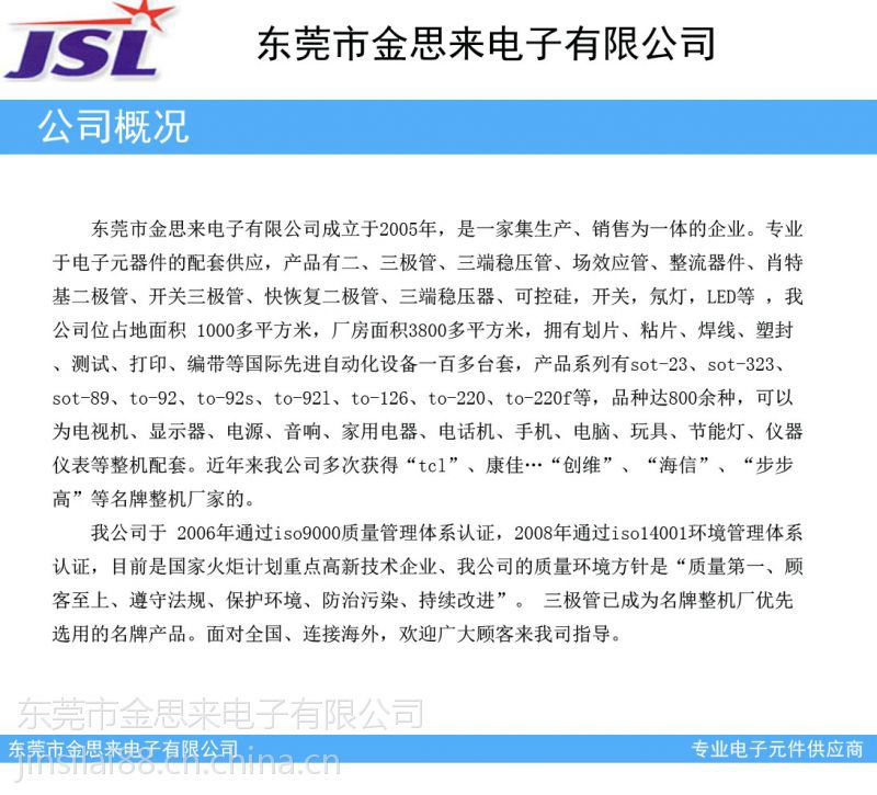 ⅰ.东莞市金思来电子有限公司销售的产品型号甚多,无法将每一个型号及详细参数一一罗列,望各位新老顾客如有需要可以电联我们,我们网上的价格不做参考,请联系我们为您准确的具体报价,也可为您提供产品的pde规格书和环保认证书。请您跟我们联系0769-22361548,qq:397568345.