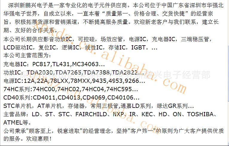 本公司是一家多元化电子元器件供应商,拥有庞大的供销网络和完善的服务系统。和美、欧、日、韩及台湾等生产厂商及代理销售机构建立了良好的合作关系,一手货源,价格优越。公司本着以质为本,以诚待人,互惠互利的原则,欢迎客户来电垂询,光临惠顾!
