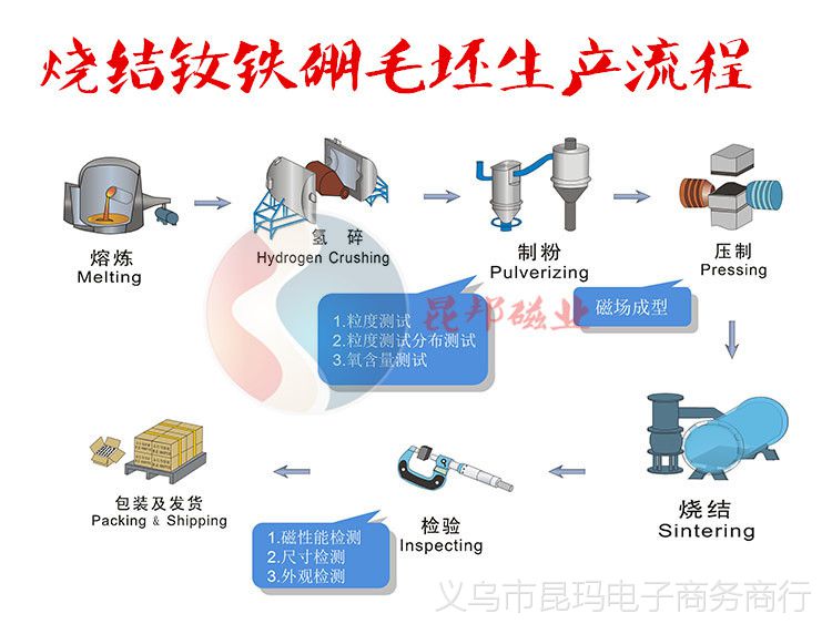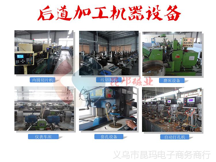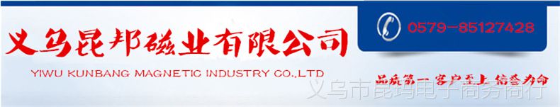 义乌市昆邦磁业有限公司成立于1996年,公司专业生产钕铁硼,铁氧体,橡胶磁!经过近十几年的发展,已成为年生产月产能力钕铁硼磁铁达100吨、铁氧体磁铁1000吨,预烧料20000吨的大型磁铁生产企业.公司占地80亩,员工456人,大专学历以上的有46人,我公司生产的产品超过几千种,产品被广泛用于各类扬声器、包装盒,饰品,玩具,直流电机,家用电器,医疗器械,计算机,航天航空,测量仪器,电子钟表,五金工具等领域产品主要销往日本、美国、澳大利亚、意大利、香港和台湾等国家和地区。