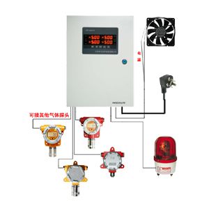 将一氧化碳气体检测探头安装于需要监测的地点,可以多点检测,通过二芯屏蔽电缆接入主机,接线时按说明书或示意图中说明,按颜色对接即可。主机安装于中控室等安全场合,根据需要安装声光报警器、排风扇等设备。当一氧化碳气体浓度超出预设报警点时,固定式一氧化碳检测仪系统发出声光报警,同时启动排风扇等设备。