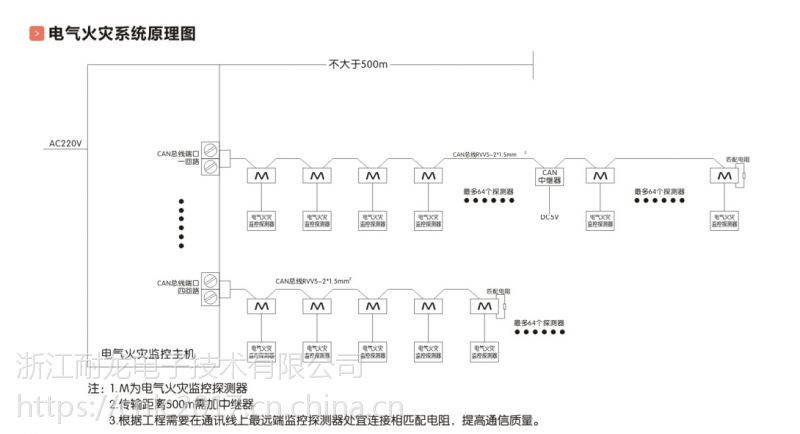 分体式剩余电流式电气火灾监控探测器配有二总线通讯功能,通过二总线通讯接口可以与本公司的监控设备主机进行组网通讯。实现远程管理、维护和控制。