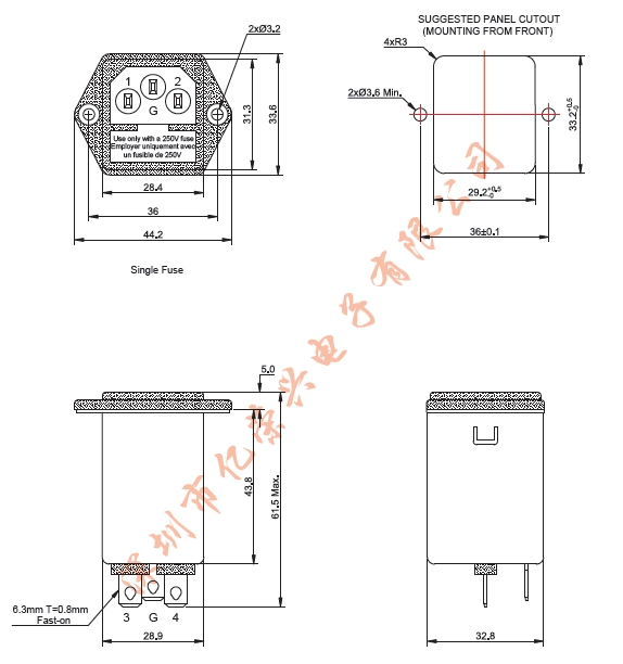 1.IEC320交流输入插座与5*20mm保险丝座、滤波器模块组合一体化