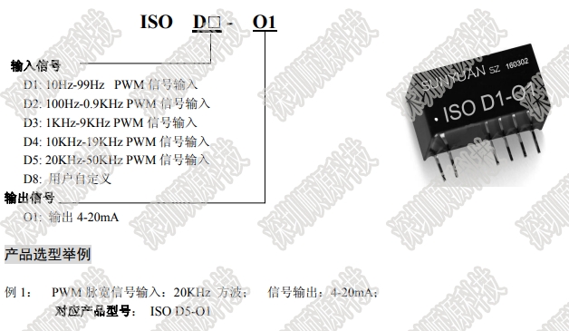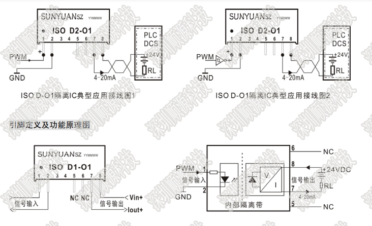 SunYuan ISO D-O1 是顺源科技新开发的小体积低功耗无源型 PWM 脉冲调宽信号隔离转换为两线 制 4-20mA 变送器 IC。该 IC 工作方式是通过后级(输出端)电流回路馈电方式,接收来自前级设备输出的 PWM 信号,经过隔离转换后输出对应的 4~20mA 标准两线制电流信号。