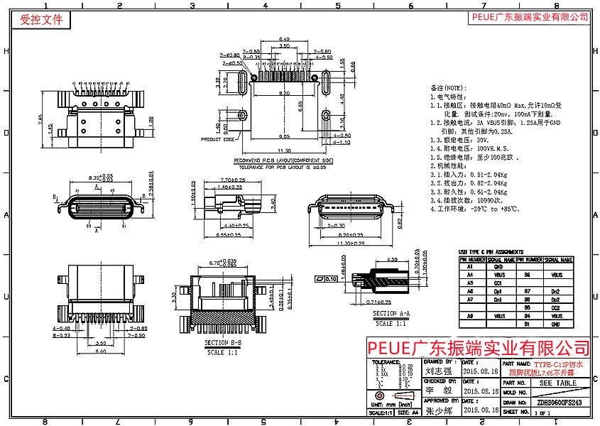 TYPE-C 12P防水沉板母座带勾两脚 拉伸外壳L7.65 3.1USB详细介绍