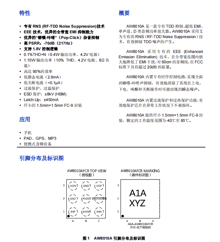 AW8010AFCR 专有 TDD 抑制、超低 EMI、单声道、D 类音频功率放大器