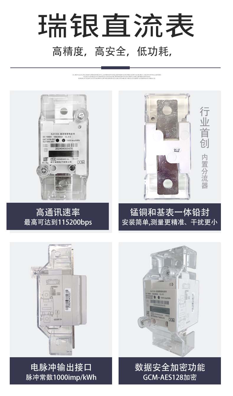 瑞银电子从事电力计量行业二十余年,多年前就设计开发了一体式直流智能电能表DJZ1226,这是专为充电桩等直流计量场景开发的新一代产品。该表采用分流器和电能表一体式设计,具有计量准确度高、体积小巧、接线方便、通信兼容性强、功能丰富等特点,可实现分流器和电能表整体封印,是直流充电桩行业的计量产品。