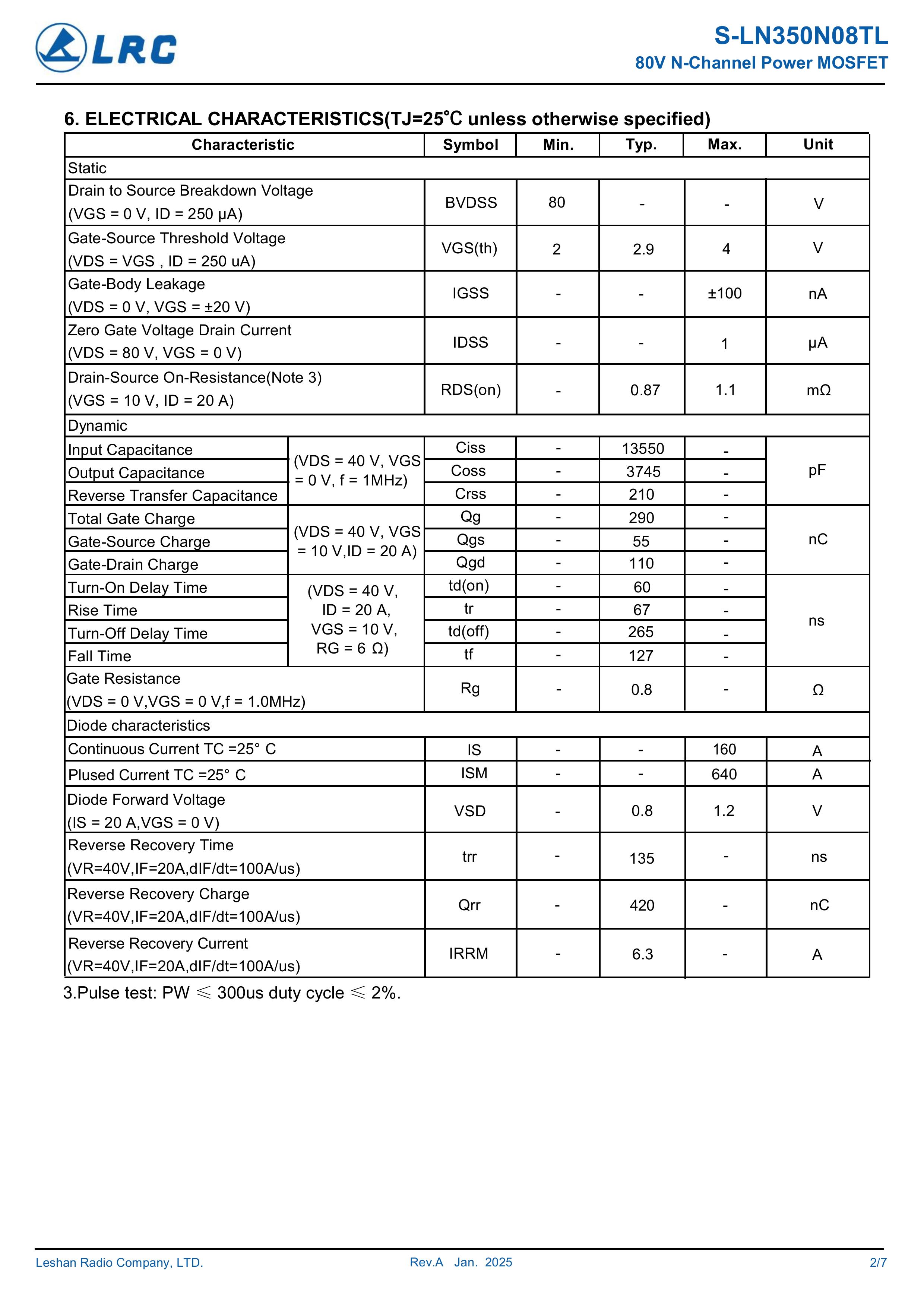 S-LN350N08TL/350N08TL 大芯片中低电压大电流低内阻低漏电的分立式功率整流晶体开关管。本品采用内置大尺寸芯片,源极7脚位支持多路输出贴片式封装,AEC-Q101认证,具有适应中低电压低内阻损耗高频高效恢复快等电气特性特点。通用于电源、小家电、锂电池、马达电机、电动工具、无人机、电器、适配器、充电器、逆变器、充电桩、特种电源、高频电源、风光储新能源、医疗设备、工业工控等产品电路作电子开关、控制、整流、放大、钳位、防反接、防逆回流等作用。