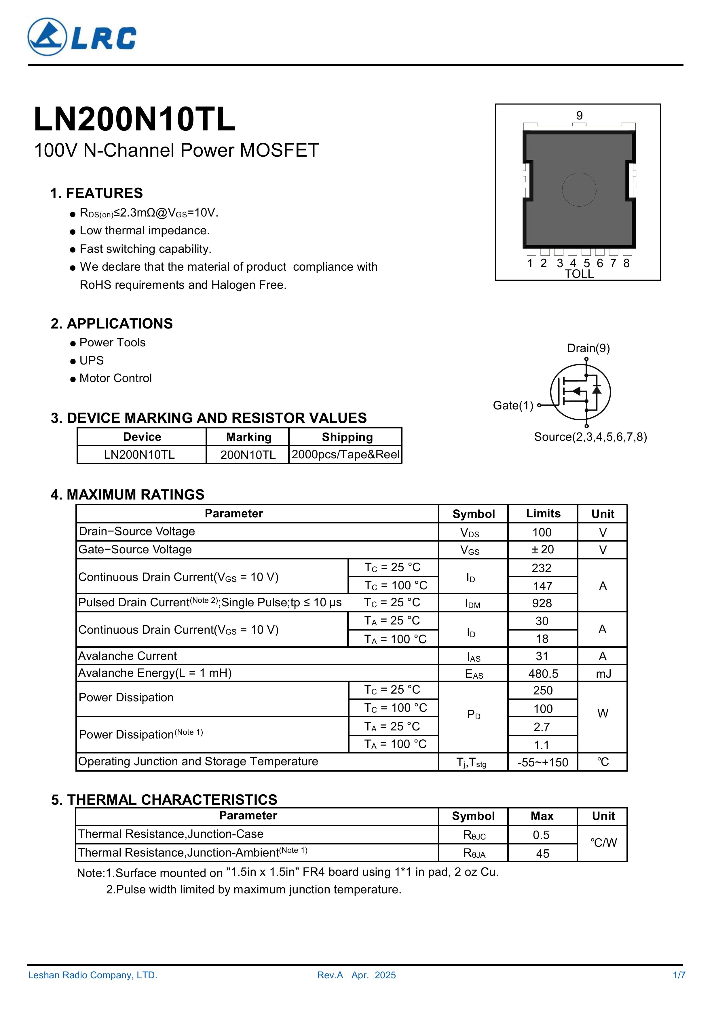 LN200N10TL/200N10TL 大芯片中低电压大电流低内阻低漏电的分立式功率整流晶体开关管。本品采用内置大尺寸芯片,源极7脚位支持多路输出贴片式封装,,具有适应中低电压低内阻损耗高频高效恢复快等电气特性特点。通用于电源、小家电、锂电池、马达电机、电动工具、无人机、电器、适配器、充电器、逆变器、充电桩、特种电源、高频电源、风光储新能源、医疗设备、工业工控等产品电路作电子开关、控制、整流、放大、钳位、防反接、防逆回流等作用。