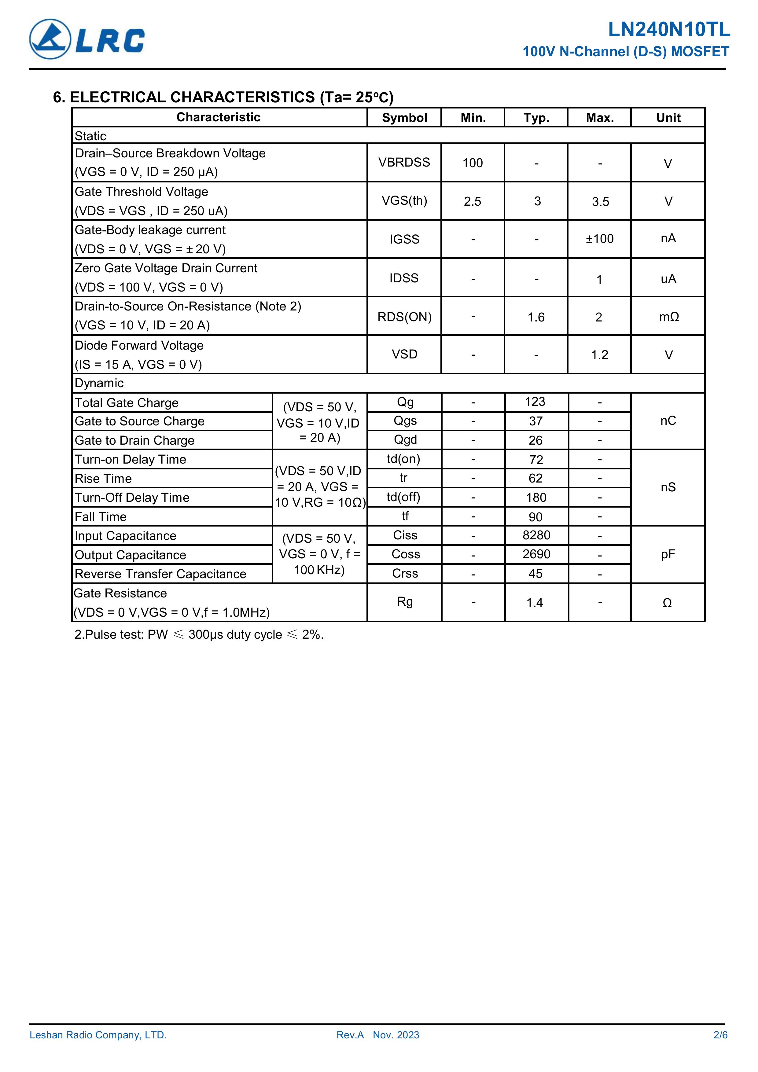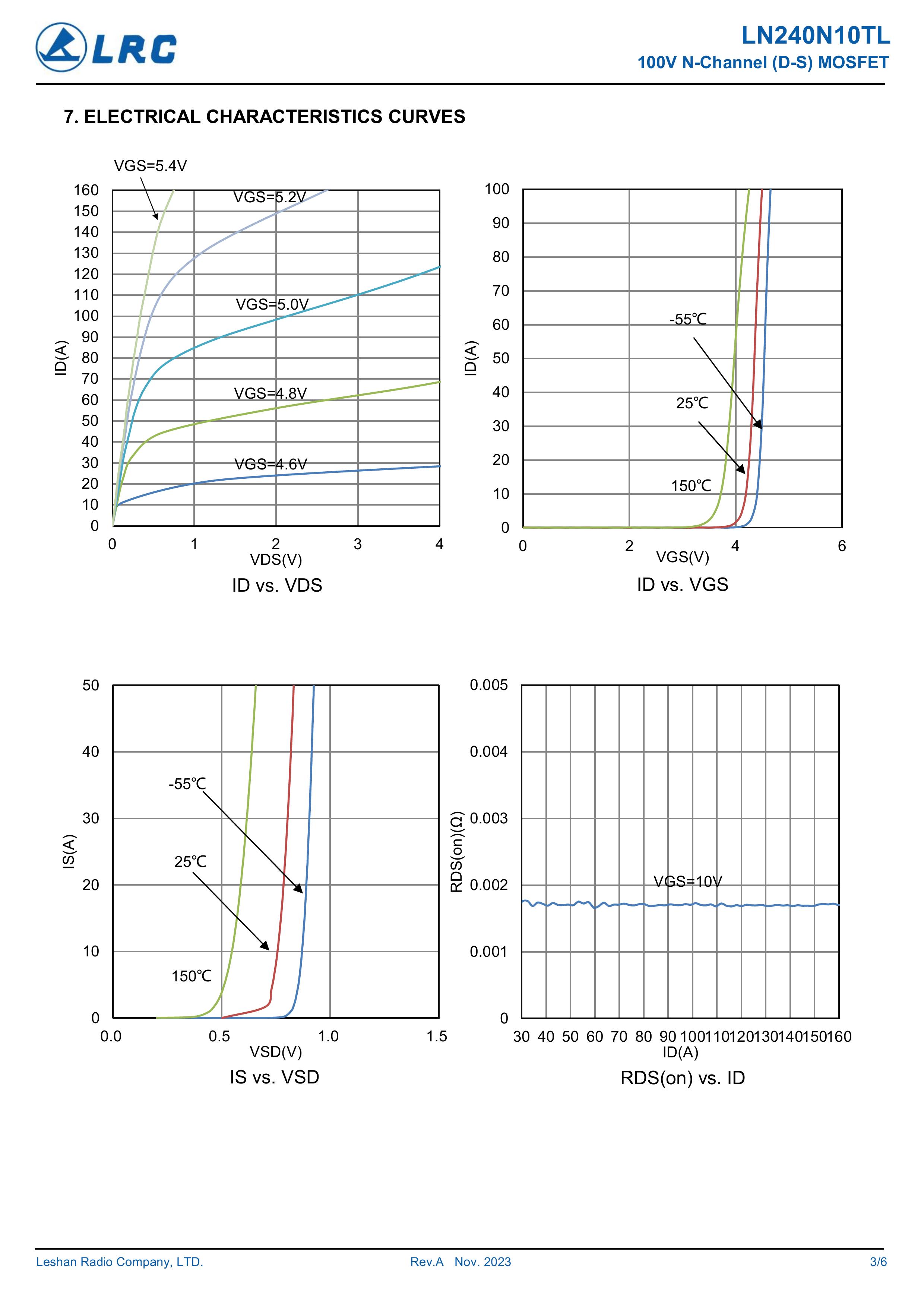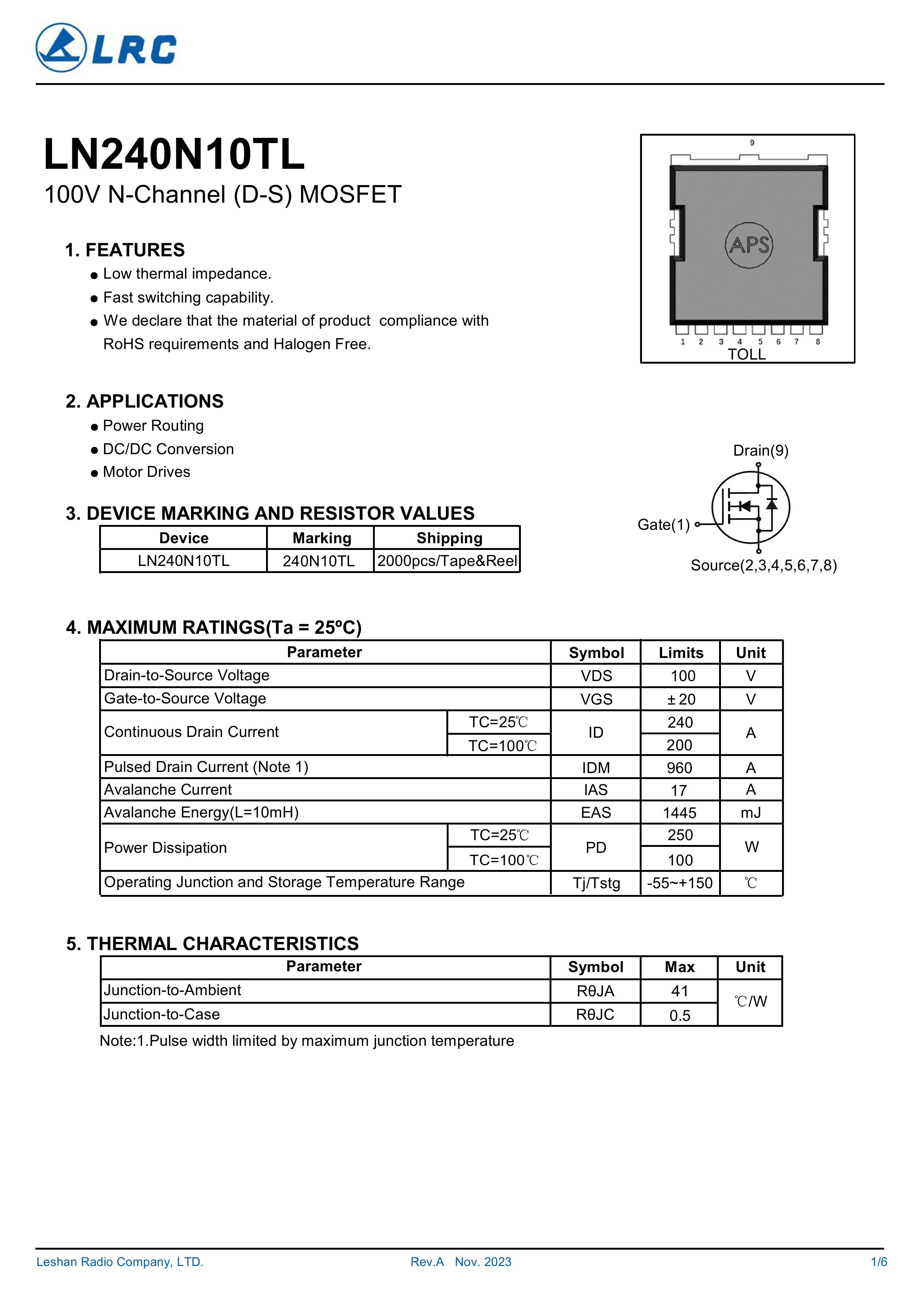 LN240N10TL/240N10TL 大芯片中低电压大电流低内阻低漏电的分立式功率整流晶体开关管。本品采用内置大尺寸芯片,源极7脚位支持多路输出贴片式封装,,具有适应中低电压低内阻损耗高频高效恢复快等电气特性特点。通用于电源、小家电、锂电池、马达电机、电动工具、无人机、电器、适配器、充电器、逆变器、充电桩、特种电源、高频电源、风光储新能源、医疗设备、工业工控等产品电路作电子开关、控制、整流、放大、钳位、防反接、防逆回流等作用。