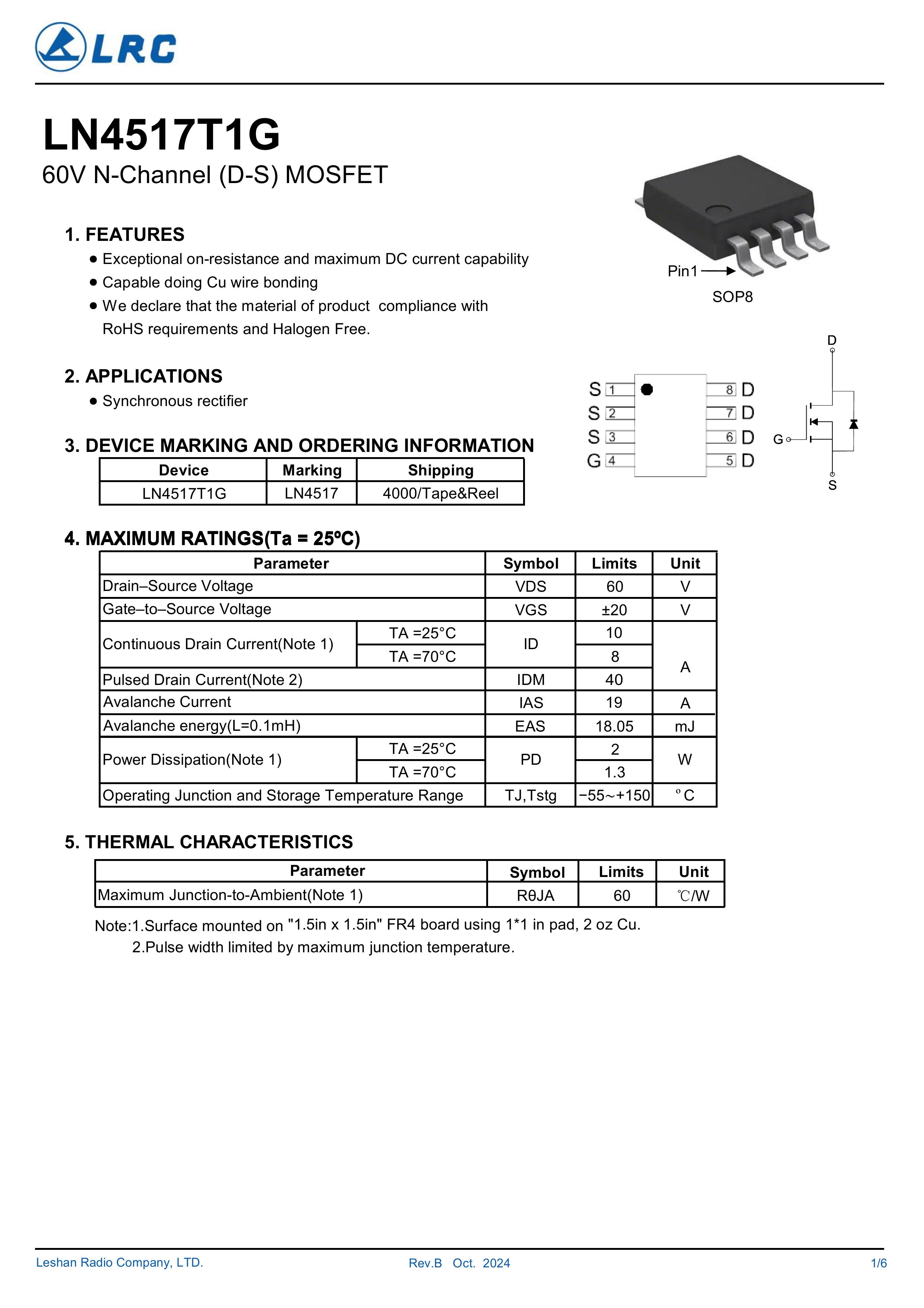 LN4517T1G/LN4517 大芯片中低电压大电流低内阻低漏电的分立式功率整流晶体开关管。本品采用内置大尺寸芯片,漏极3脚位源极4脚位,支持多路输入 输出贴片式封装,,具有适应中低电压低内阻损耗高频高效恢复快等电气特性特点。通用于电源、小家电、锂电池、马达电机、电动工具、无人机、电器、适配器、充电器、逆变器、充电桩、特种电源、高频电源、风光储新能源、医疗设备、工业工控等产品电路作电子开关、控制、整流、放大、钳位、防反接、防逆回流等作用。