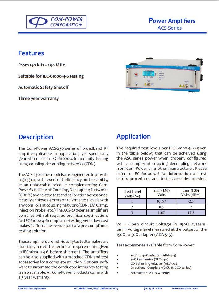 无*比的价格提供高增益、卓越的效率和可靠性。它补充了Com-Power的全系列耦合/去耦网络(CDN)以及相关的测试和校准附件。ACS-230系列放大器符合IEC 61000-4-6符合性测试的所有技术规范,但其低成本使其即使作为符合性前测试解决方案的一部分也能负担得起。这些放大器在装运前均经过单独测试,以确保它们符合IEC 61000-4-6中给出的技术要求。放大器还可以提供匹配的CDN和测试配件,以获得完整的解决方案。还提供了自动化进行抗扰度测试的可选软件。Com-Power的所有产品都有3年的保修期。根据IEC 61000-4-6,当与Com-power或其他制造商的兼容耦合去耦网络正确配置时,可以使用ASC系列电源实现所需的测试水平。有关测试设置、程序和所需测试附件的信息,请参考IEC 61000-4-6。