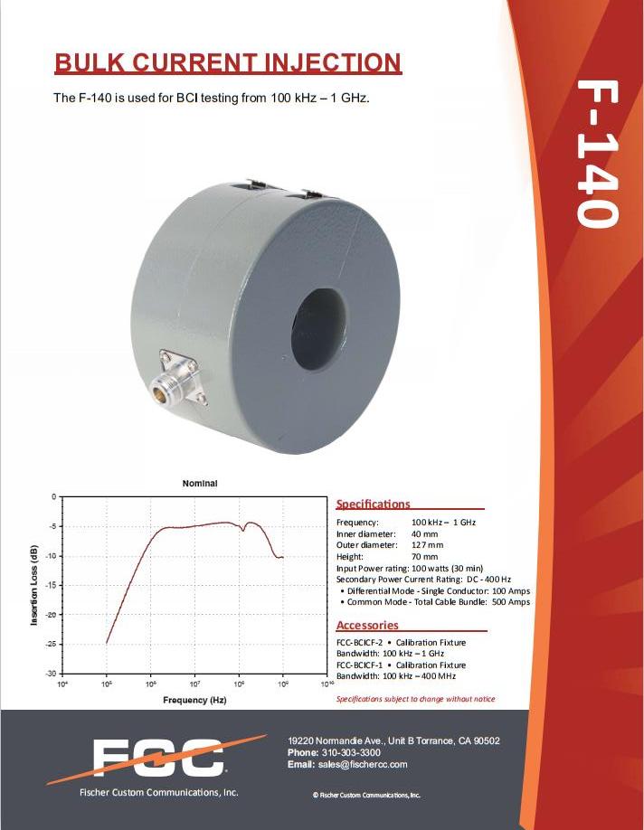 Fischer Custom Communications, Inc. 开发和制造大电流注入探头 [BCI探头],以满足特定客户要求并根据 Mil-Std-461/462、RTCA/DO-160 第 20 和 22 节、Bellcore TR-NWT-001 089、SAE Jl5447、EN 55101-4 和 CSEFA-2 EuroFighter 执行合规性测试以及其他磁敏度规范。