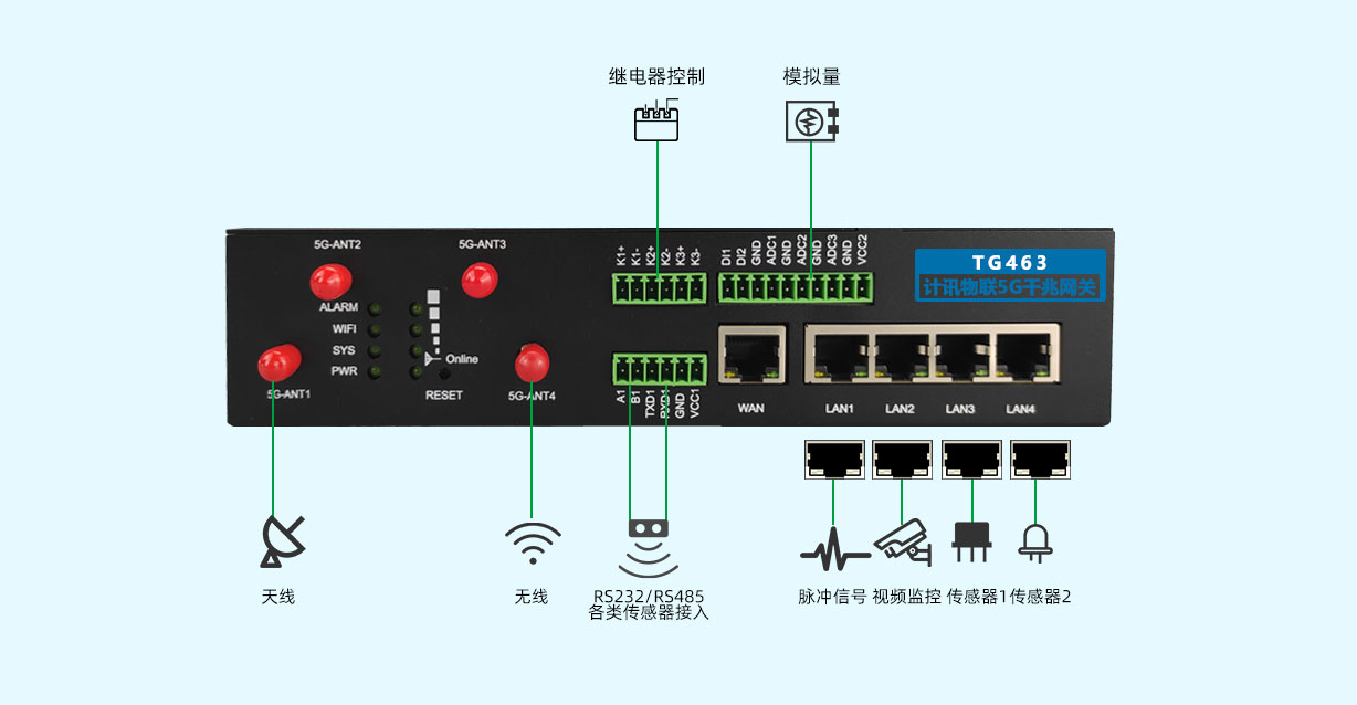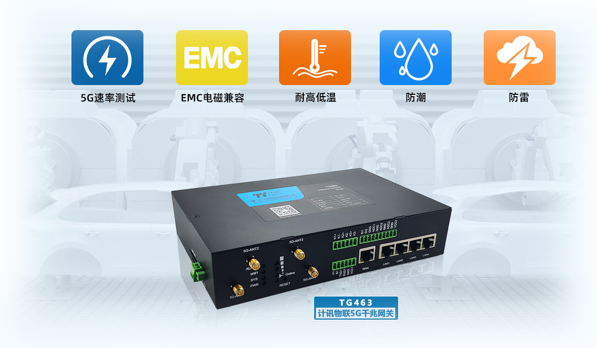 计讯物联TG463 5G千兆网关集成了前端数据采集和5G千兆速率传输功能,提供模拟量/数字量/开关量等数据采集控制、支持视频/图像/语音采集。支持全网通/5G/4G/GPS/WiFi等无线通信。兼容各行业通信协议及行业规约,满足各种工业应用组网。