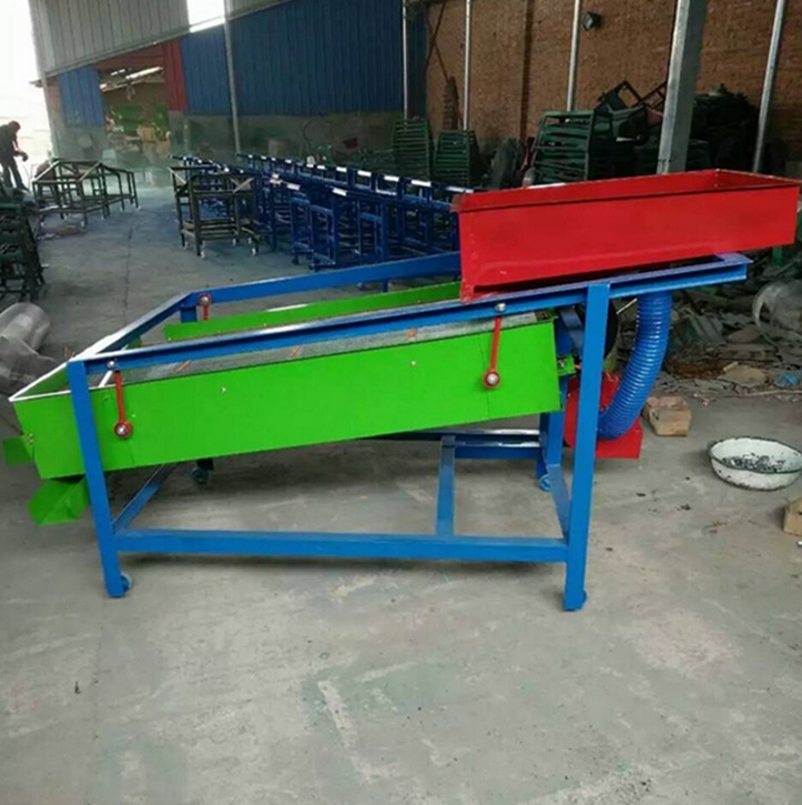该机结构新颖紧凑、运转平稳、巧、筛分效率高。从而大大降低了劳动强度,提高了工作效率;是粮食和油料安全入仓,且能防虫、防霉不可缺少的选筛分设备。 粮食清选机 |重清选机|复式清选机|带式清选机|多功能清选机:该机的风选功能主要是靠立式空气筛来完成的,它根据种子的空气动力学特性,按照种子和杂质临界速度的不同,通过调整气流的速度,实现分离的目的,较轻的杂质被吸入沉降室集中排出,较好的种子通过空气筛后进入振动筛。振动筛分上下两层筛,设有三种出口,可以分别将大杂、小杂和获选种子排出(特殊要求可安装三层筛、设四种出口,多用于分级)。