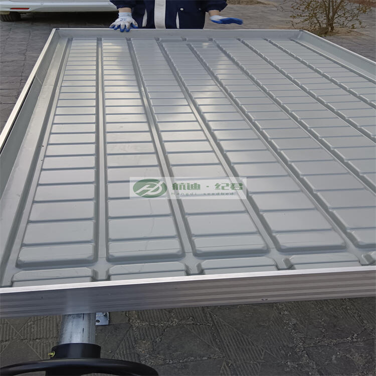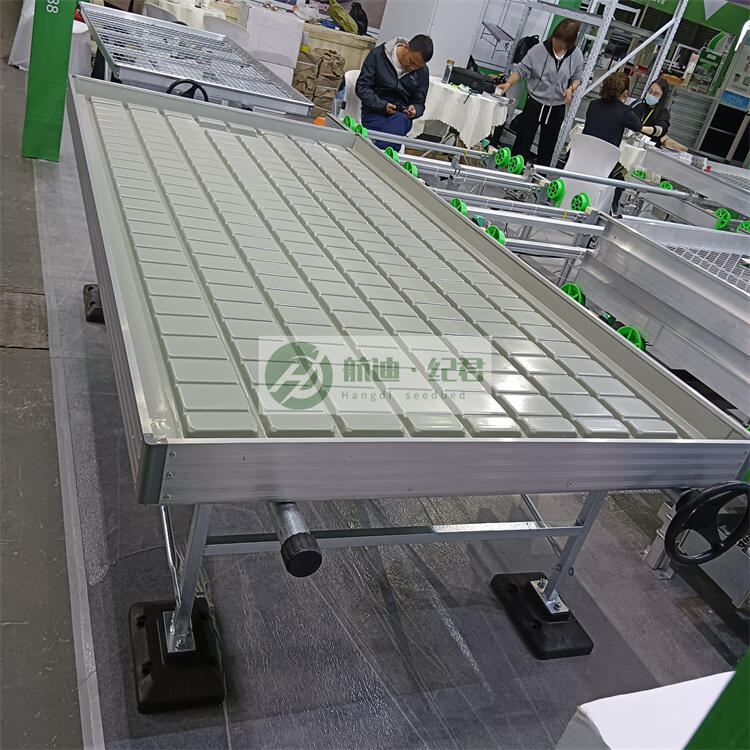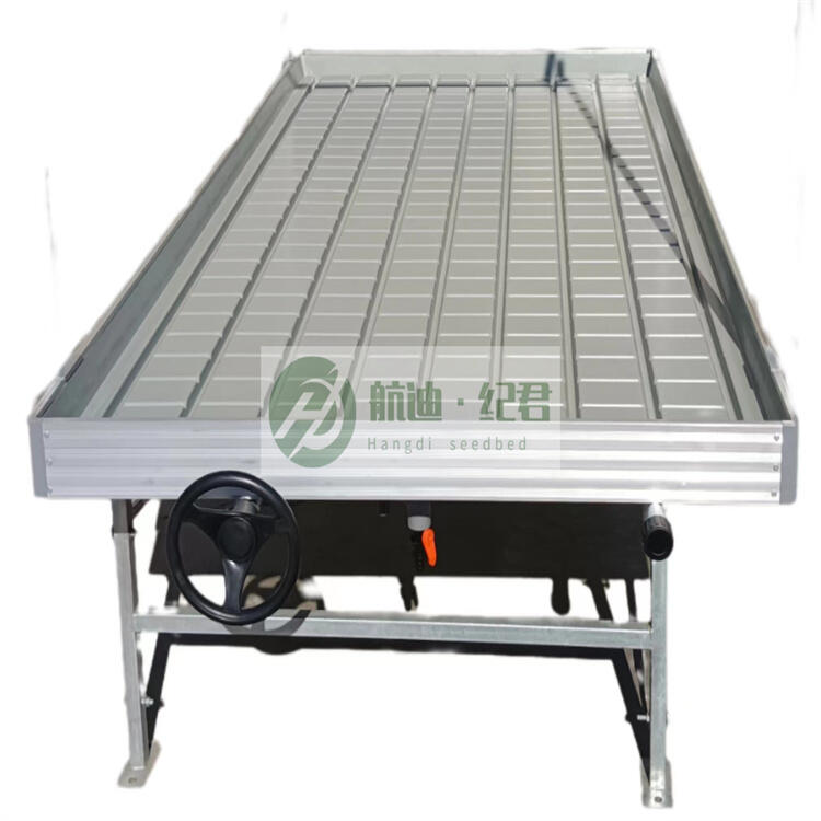 潮汐式灌溉移动苗床是一种针对盆栽植物营养液栽培或容器育苗和无土栽培所设计的底部给水的的灌溉方式。该方式利用落差原理,实现定时给水与施肥。国内外大量的试验研究表明,采用潮汐灌溉方式的作物,其生长量明显优于人工浇灌方式,不但能降低坏疽叶和皱折叶的发生,还可减少用水量达33%,提高水分利用效率达40%。由于潮汐灌溉没有淋浴作用,还能减少氮素使用量达30%~35%,大大提高氮素的利用效率。