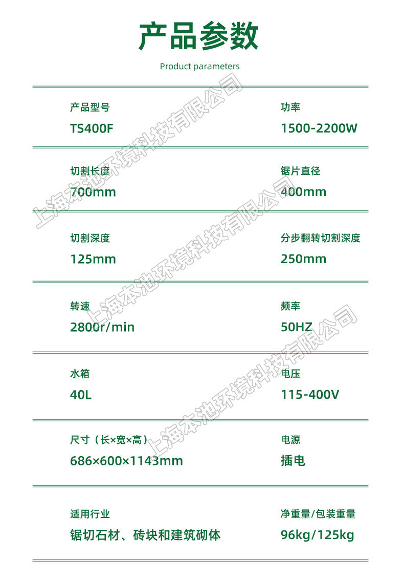 Husqvarna富世华/胡斯华纳TS400F石材锯 台式锯 石材切割机,它锯切能力强,适用于锯切各种砖和建筑砌体。 采用这种台式锯,一次性锯切深度可达125mm,分步翻转切割深度可达250mm。可45°斜切,非常灵活。坚固结实的整体式框架,配有一体化的输送轨道,刚性好。机器装有可折叠的支腿,单人操作方便。