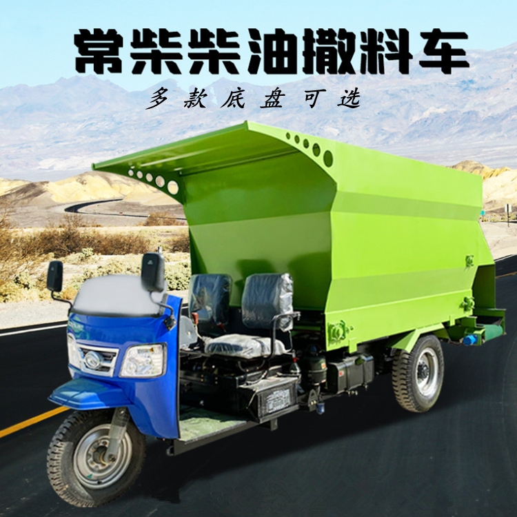 撒料车的主要功能是将成品日粮直接抛撒在饲喂区域内一次性完成饲喂,广泛用于农牧业养殖区,大中型饲养场和规范社区饲养场的饲喂作业,可将各种牧草,农作物秸秆,青贮饲料等纤维性饲料混合搅拌均匀后,投入本车内,进行投喂作业。使用简单方便,易于操作,产品质量可靠,经久耐用,撒料过程中可根据用户的圈宿牲畜的密度调节饲喂料,使用效率高,省时省力,节省养殖场空间。