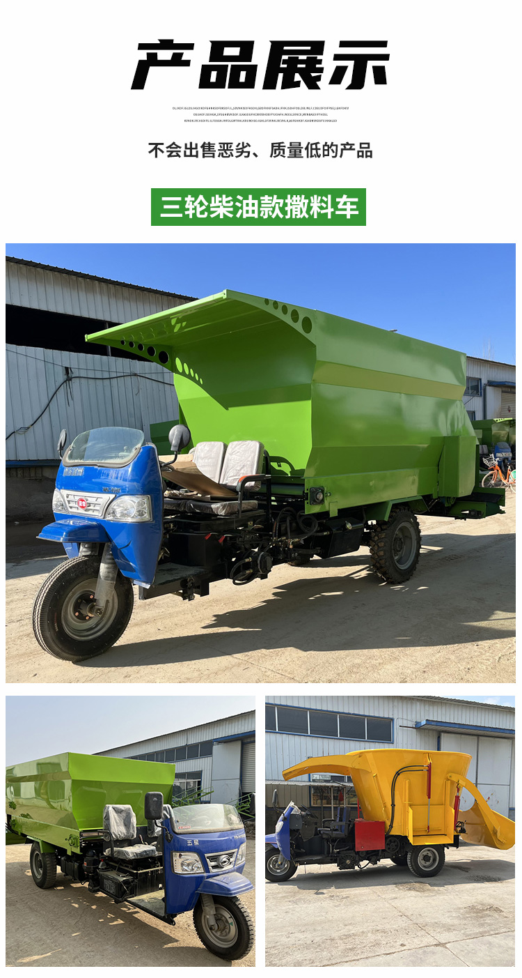 撒料车的主要功能是将成品日粮直接抛撒在饲喂区域内一次性完成饲喂,广泛用于农牧业养殖区,大中型饲养场和规范社区饲养场的饲喂作业,可将各种牧草,农作物秸秆,青贮饲料等纤维性饲料混合搅拌均匀后,投入本车内,进行投喂作业。使用简单方便,易于操作,产品质量可靠,经久耐用,撒料过程中可根据用户的圈宿牲畜的密度调节饲喂料,使用效率高,省时省力,节省养殖场空间。
