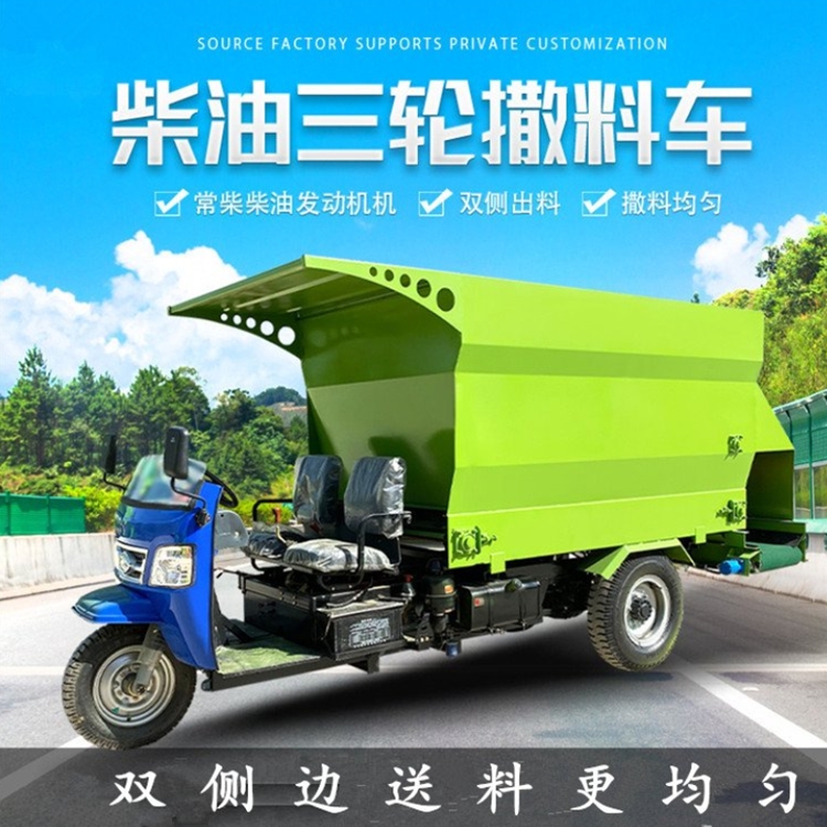 撒料车的主要功能是将成品日粮直接抛撒在饲喂区域内一次性完成饲喂,广泛用于农牧业养殖区,大中型饲养场和规范社区饲养场的饲喂作业,可将各种牧草,农作物秸秆,青贮饲料等纤维性饲料混合搅拌均匀后,投入本车内,进行投喂作业。使用简单方便,易于操作,产品质量可靠,经久耐用,撒料过程中可根据用户的圈宿牲畜的密度调节饲喂料,使用效率高,省时省力,节省养殖场空间。