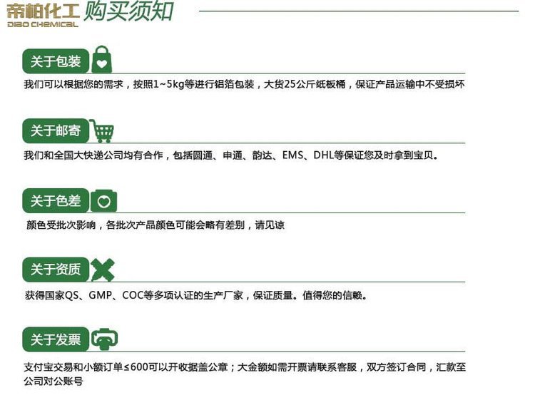 帝柏化工提示:我公司仅提供常规原料产品;合作对象:公司、单位,不对个人销售!