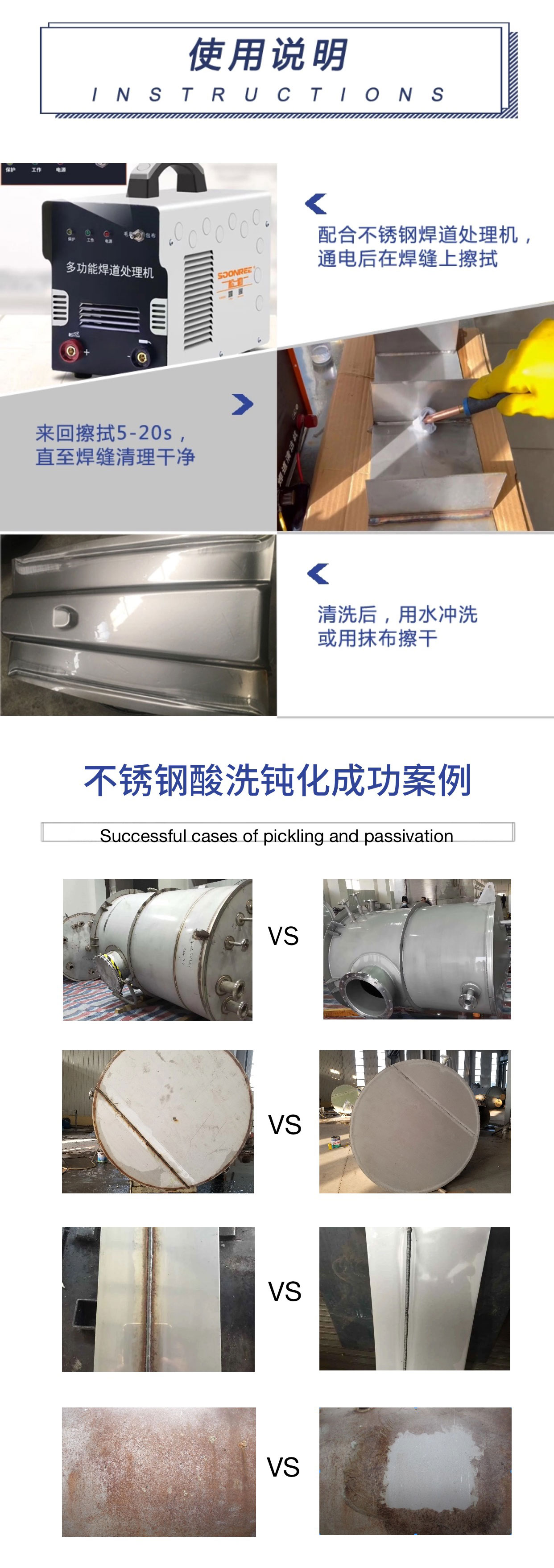 使用方法 | 配合不锈钢焊道处理机,通电后配上焊缝处理液在焊缝焊斑的位置上来回擦拭5-20秒,焊斑清洗干净后然后再用清水冲洗干净即可 | ||