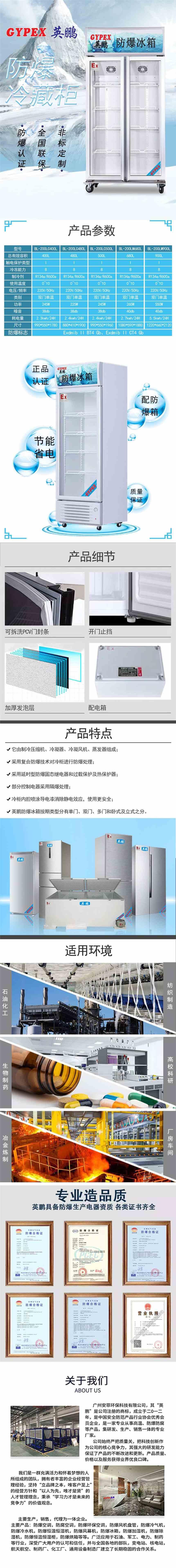 英鹏防爆冰箱 双门冷藏防爆冰箱 主要参数: 型号:BL-680 类别:双门单温 制冷方式:直冷 温度范围(℃)0≤t≤10 电源:220V/50Hz 耗电量:2.70kwh/25h 噪声:≥38db 功率:480w 制冷剂:R134a/220g 净重: 155KG 外形尺寸:610*555*2000mm 内径尺寸:720*530*1330 mm 防爆标志:Exdmib Ⅱ BT4 适用范围: 1.本产品适用于石油化工、实验室、冶金、医药、纺织、食品、生物工程、制药、仓库、航天航空工程及军工等性环境中,有温度控制要求的场所; 2.1区、2区危险气体场所 3.IIA、IIB、IIC类T1-T4组性气体或蒸汽环境; 4.环境温度:-5℃~+43℃。 可广泛使用于石油、化学化工、医药、航空航天、实验室、储藏、军事等部门具有ⅡC级,温度组别为T4的性气体混合物的l区(或2区)内部危险性场所,BL系列工业级集成防爆冰箱,是采用集成防爆技术,按工业环境使用要求制造的ⅡC级防爆制冷系统。