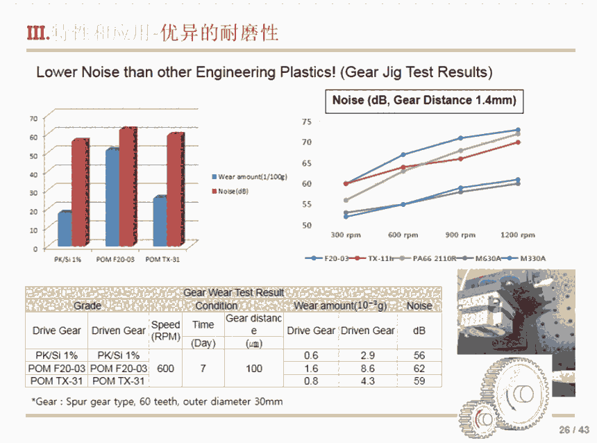 6、摩擦性能:性为POM的14倍,具有低噪音。