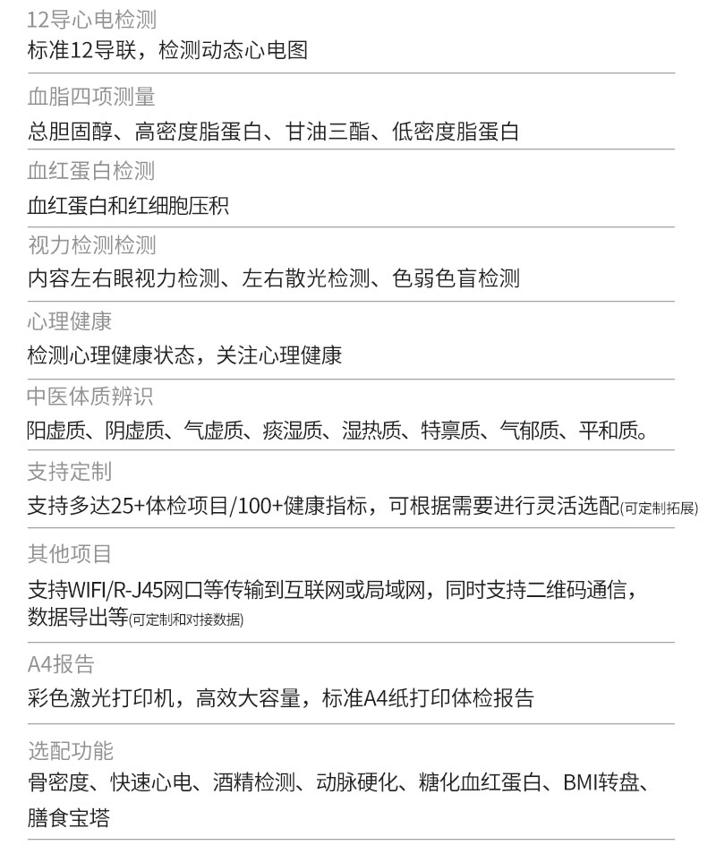 其他项目 | 设备支持多达20 体检项目,90 个健康指标 | ||
