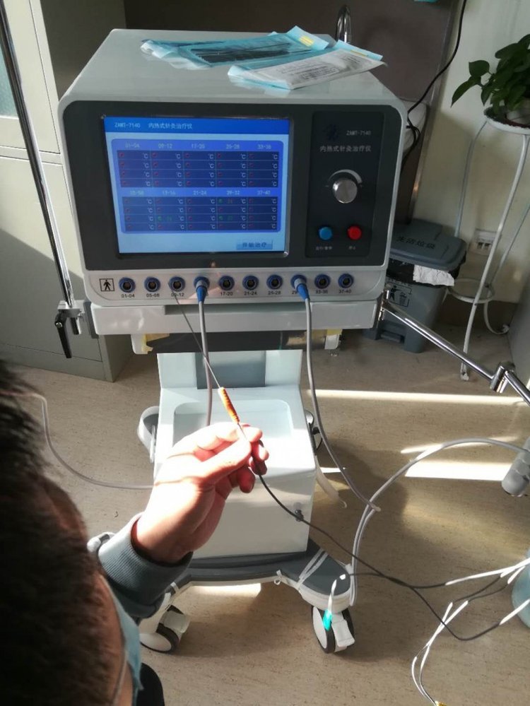 内热式针灸仪:整套设备由内热式银质针加热仪、内热针连接线和内热针三部分组成,内热式针灸仪主要是内热针的供能设备,该设备能够同时提供20、30、40支内热针的稳定能量,同时以数字形式显示,并能在38℃~60℃的范围内调节控制,内热式针灸仪主要按常规把针体的发热温度设置在38℃~60℃之间,进行无级调控温度,以保持所需要的恒定温度。和设备配套的内热针是特制的专用针具,外观是由电极、针柄和针体组成,采用低电压,微电流工作。内热针内部安置了电致热微细发热管芯,是全封闭的结构,该结构不怕浸泡,耐高温(250℃),保证了高温高压消毒的安全性,内热针通过控制微细发热管芯,使针具内部产生红外热能,由于红外热能集中在针体的下3/5—4/5部位,内热针工作时,针体通道周围直径1—1.8cm范围的环境中,温度稳定地保持在40—60℃左右。