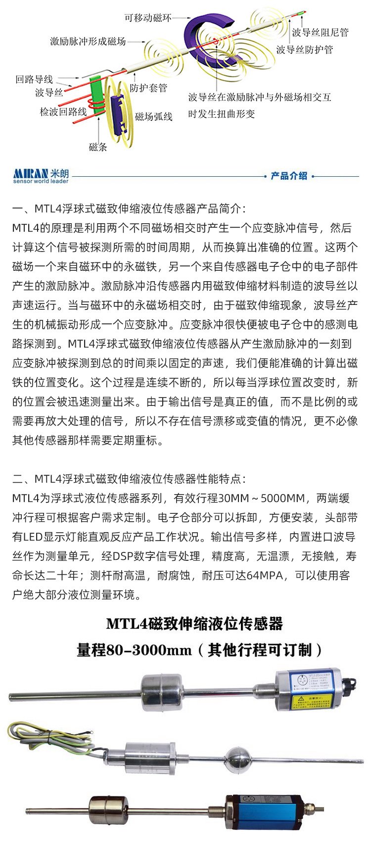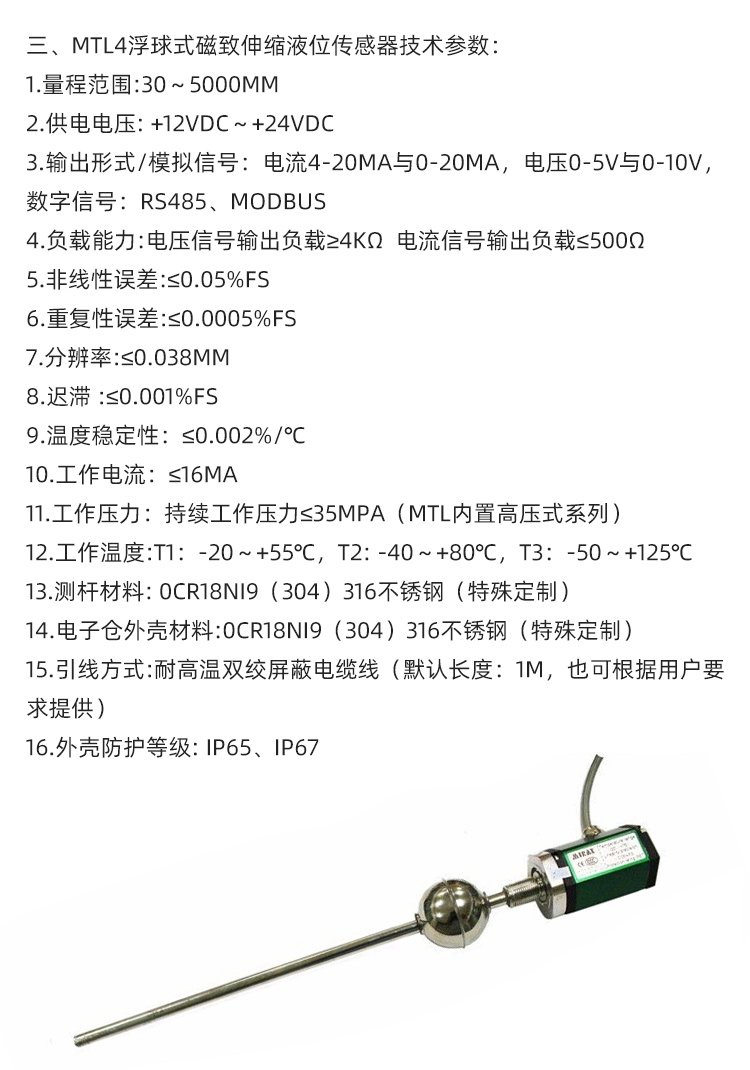 米朗MTL4-1000MM-N/A-P磁致伸缩液位传感器 浮球式 精度高无温漂 品牌 | 米朗MIRAN | ||