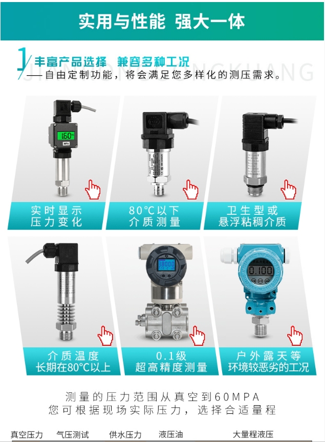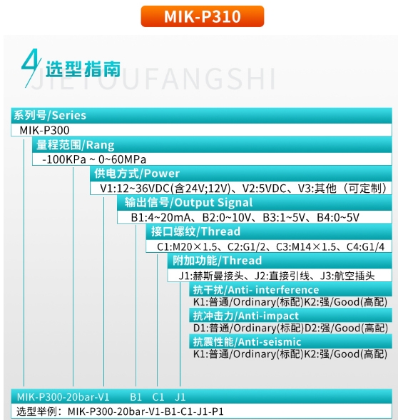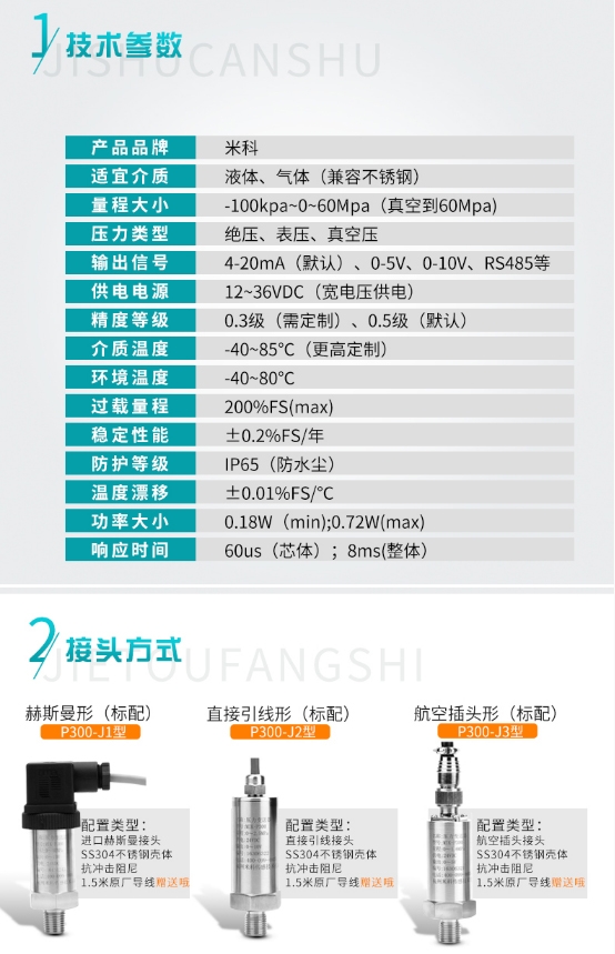 温馨提示:MIK-P300/MIK-P300G/MIK-P400/MIK-PX400系列压力变送器为进口扩散硅芯体精工制作而成,产品质保五年,各种量程大小,输出信号,安装螺纹均可订做!