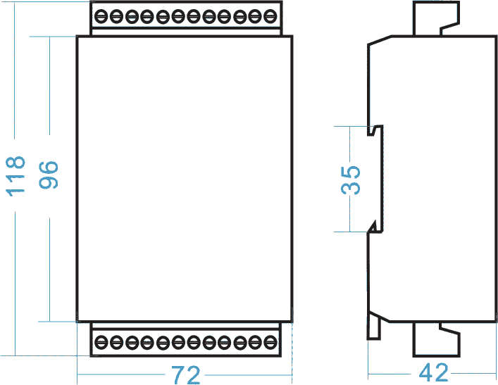 安装:采用35mm 标准DIN导轨安装,固定导轨后,将模块卡入导轨即可;