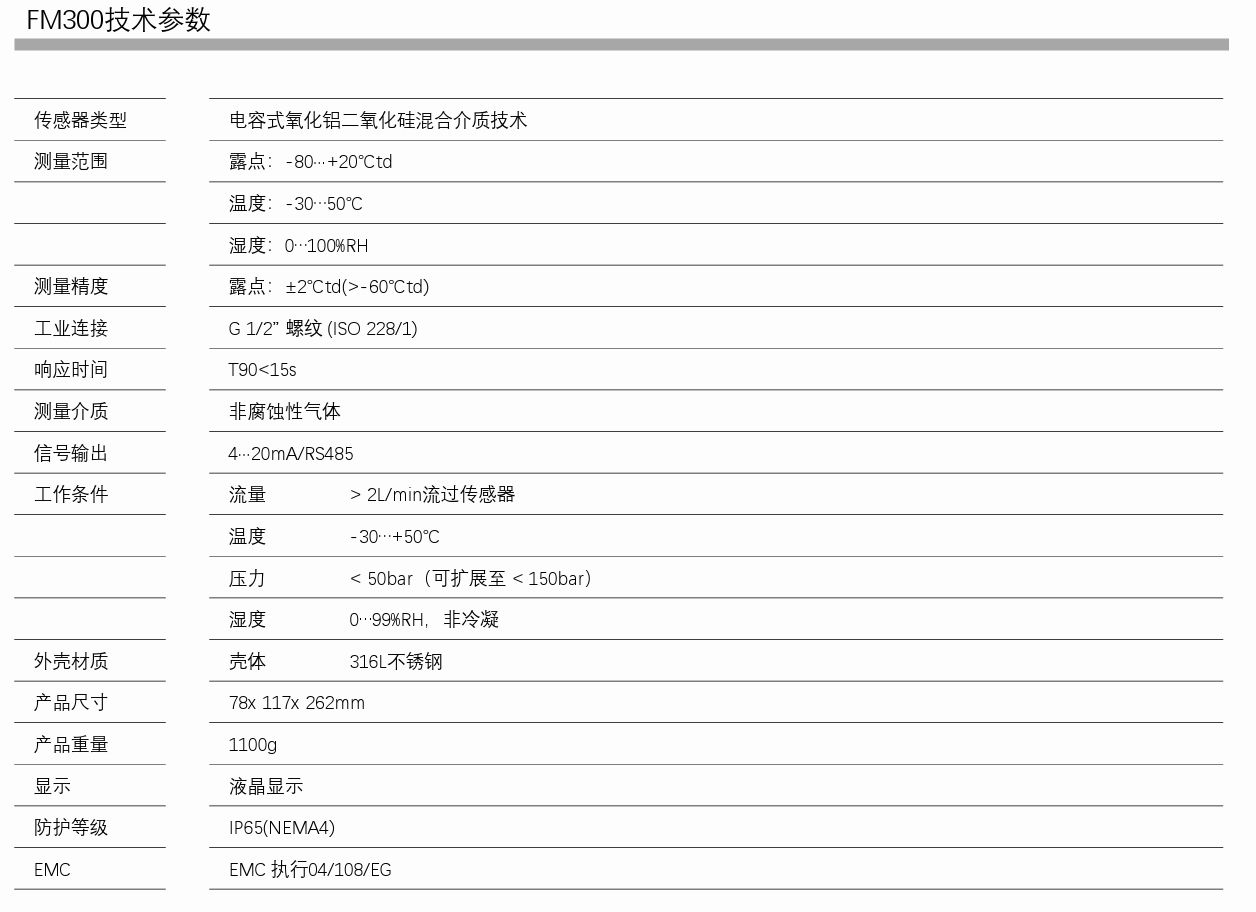 FM300的额定测量范围为-100···+20°Ctd,能够满足大部分工业生产的露点测量需求。外壳采用不锈钢材质,具有较高的保护性和抗腐蚀性。